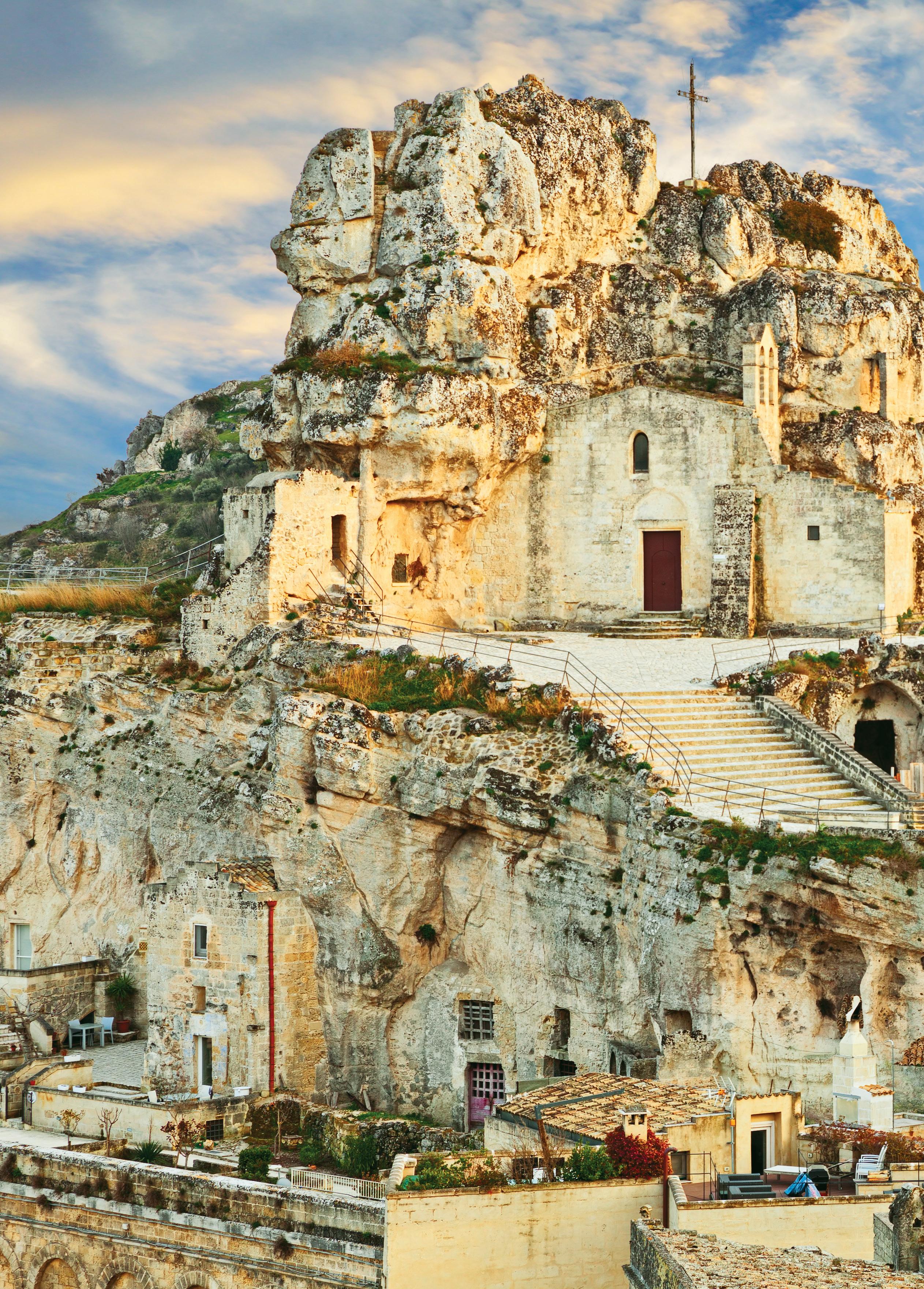 Materais,infact,ofalltheworld’scitiesinhabitedtoday,oneof themostancient.Amagicalplacethatpreserves,initsnatural caves dug out of the rock, evidence of human settlements since the Palaeolithic period. Over the centuries, the two Sassi,CaveosoandBarisano,symbolofthecity,havebeenmodelledintoincreasinglycomplexstructures thatmakeupthetwolargeurbanamphitheatres.WhenvisitingMatera,locatedinBasilicataonalimestone plateau,characterisedbydeepfissures,ravines,rocksandcaves,onehasthefeelingofenteringanativity scene.Houses,churches,monasteries,andhermitagesareallbuiltinthenaturalcavesoftheMurgia,ina landscapesoevocativethatithasbeenchosenasthesettingformanyfamousfilmproductions,suchas MelGibson's'ThePassionoftheChrist'andPierPaoloPasolini's'TheGospelaccordingtoSt.Matthew'.