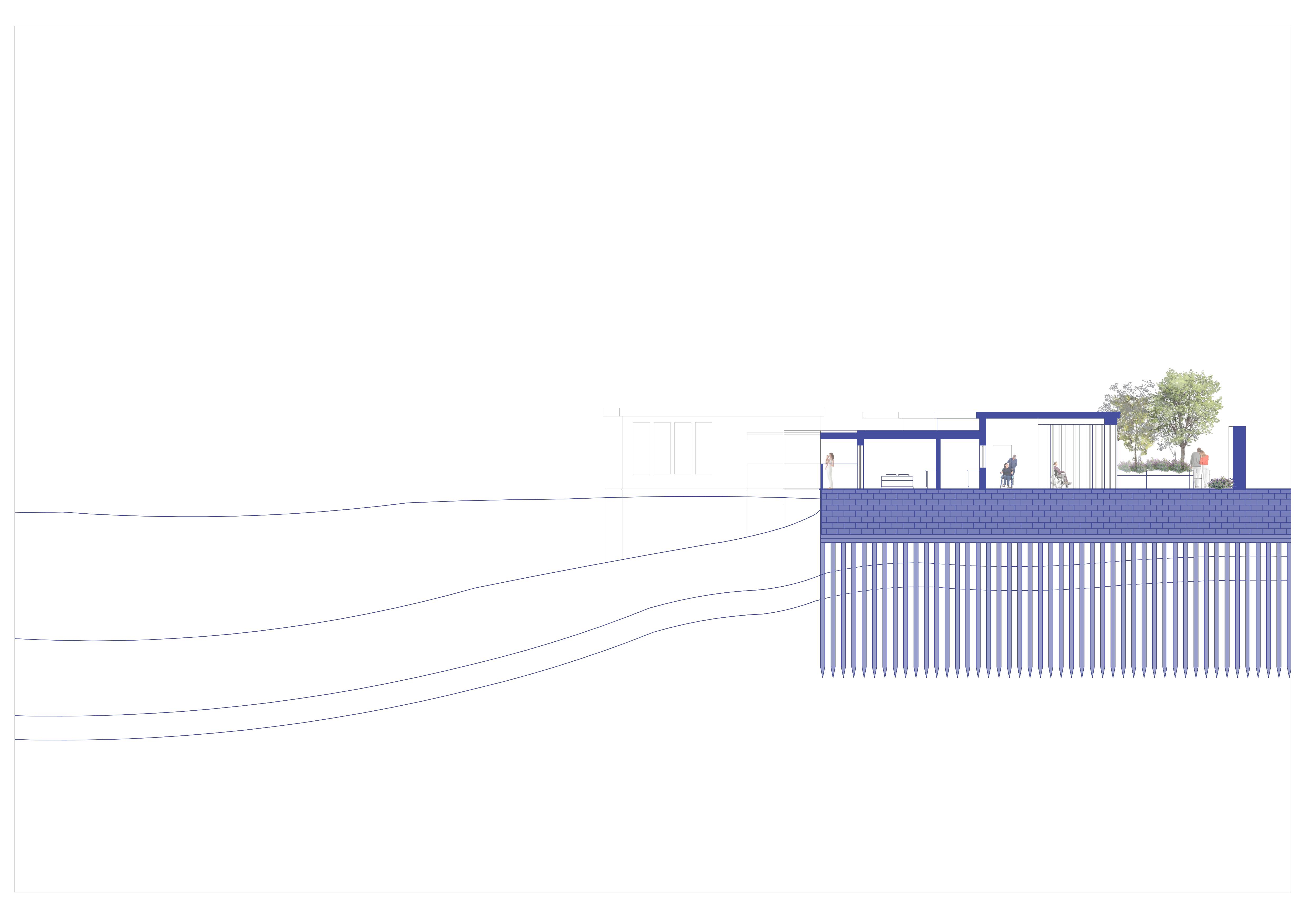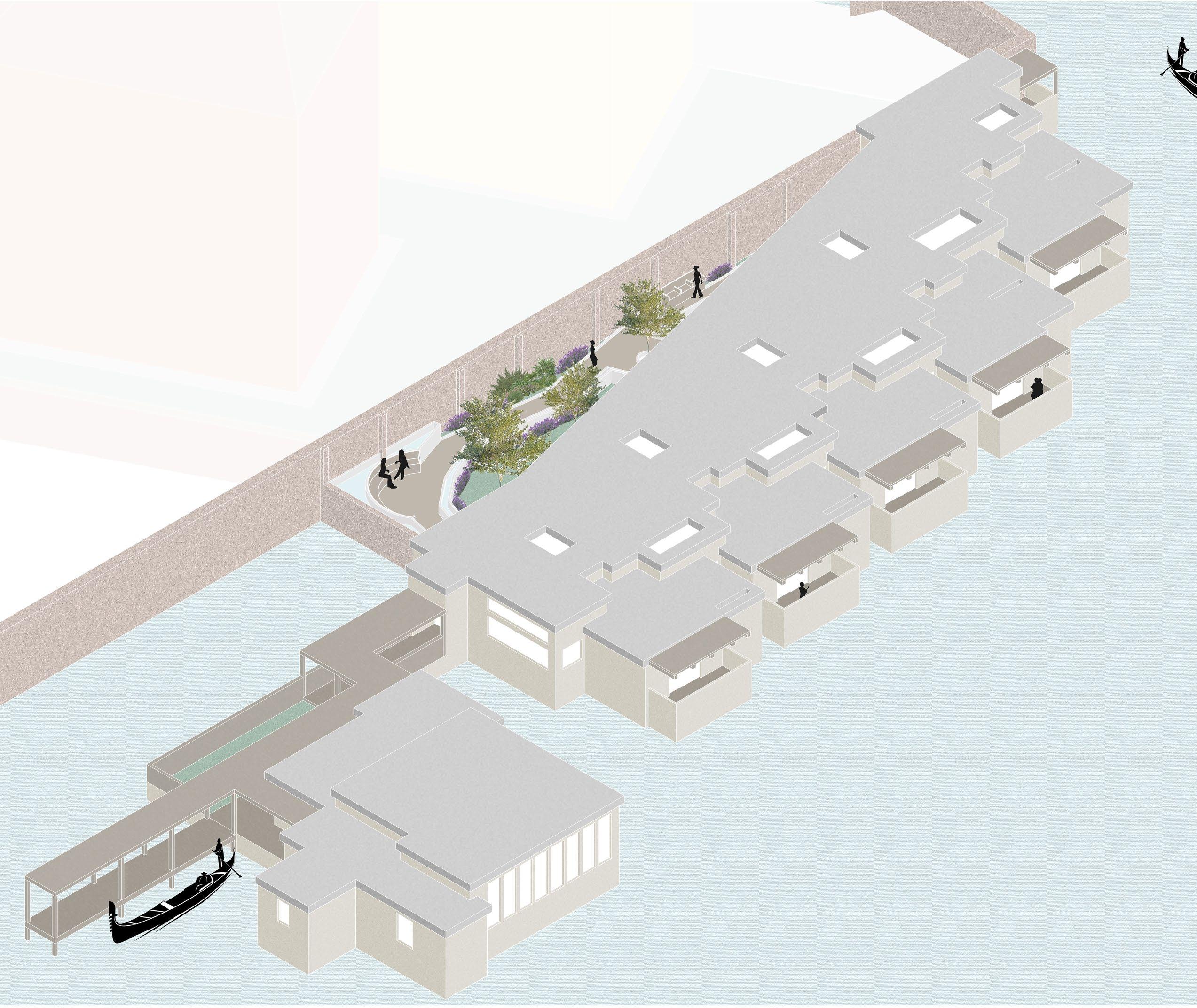 A shared corridor and central garden create moments for pause and quiet encounter, encouraging gentle movement through the building. At the water’s edge, a small port serves both as a peaceful threshold to the lagoon and as practical emergency access when needed.