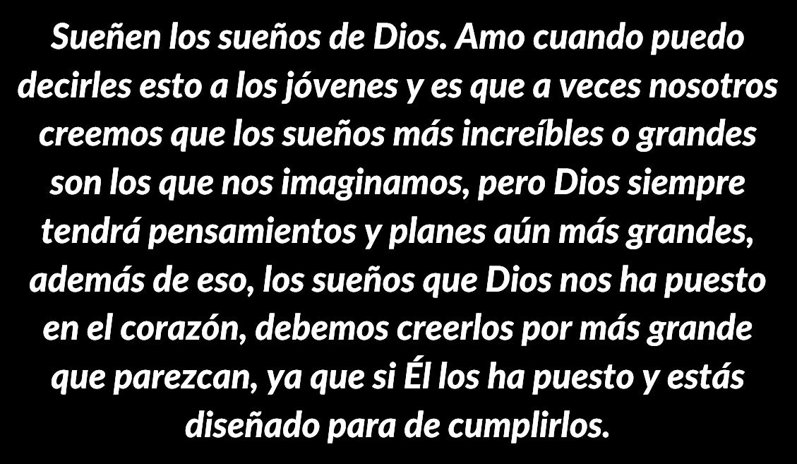 No dejen de Soñar y trabajen fuete sin desmayar, sin desviar su mirada y pasión del propósito, que debe ser Glorificar a Dios y ser una herramienta útil en sus manos, siendo excelentes y profesionales en todo. DIOS RESPALDA ESO.