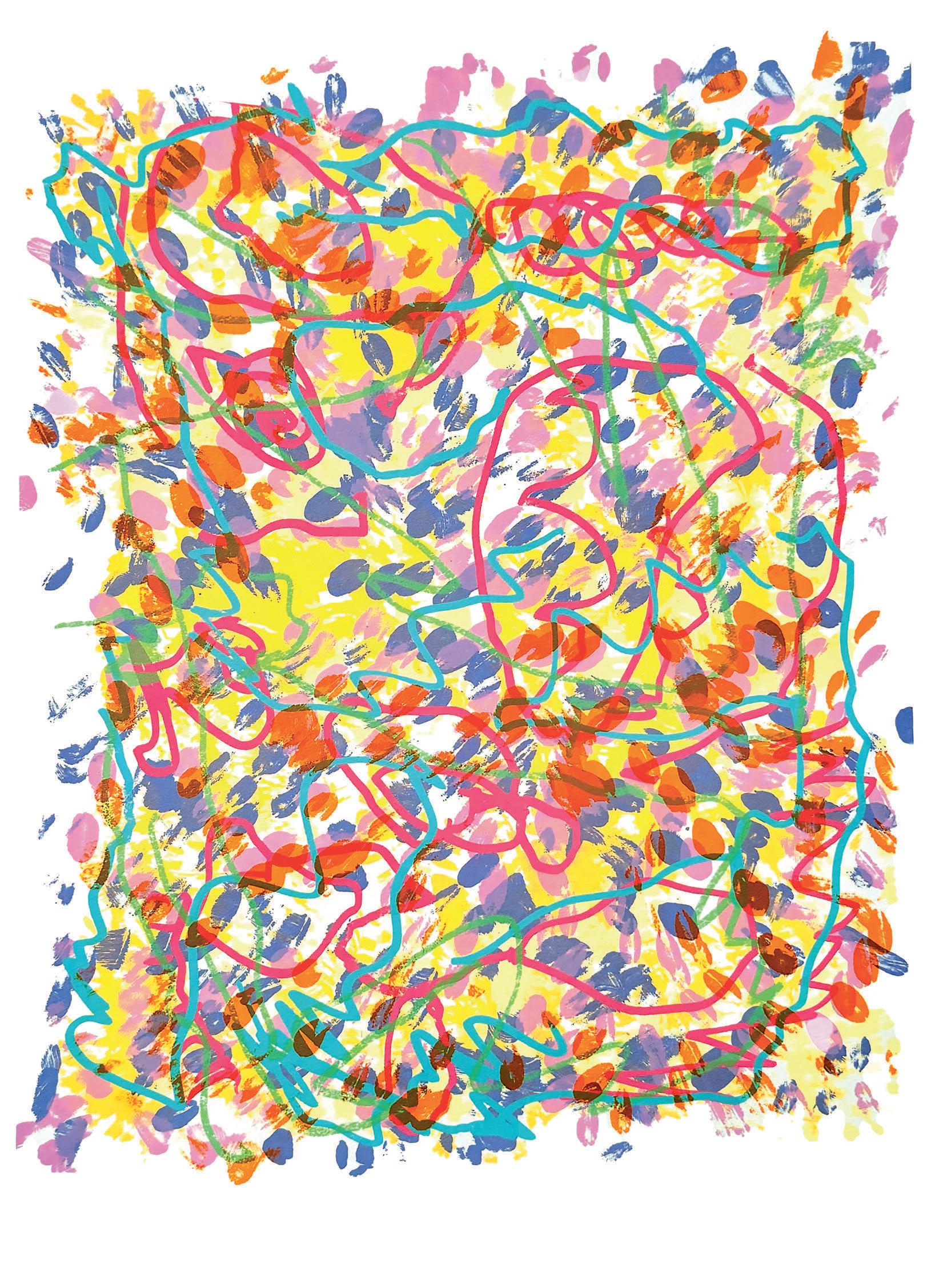 Their collaboration on First Light took place over several months. They started the process at Hebrew Home, where EJ lays the foundation for the piece. This involves drawing in black on tracing paper, creating five unique pages, one for each color she wants in the final print. She has