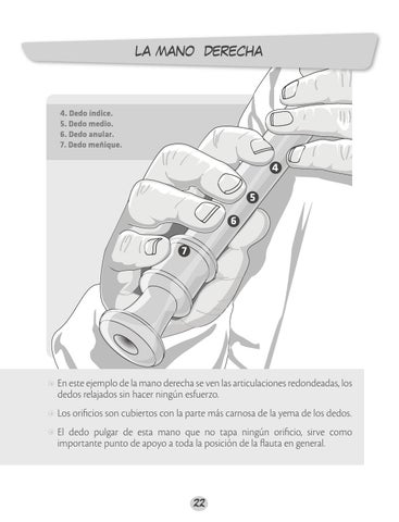 En este ejemplo de la mano derecha se ven las articulaciones redondeadas, los dedos relajados sin hacer ningún esfuerzo. Los orificios son cubiertos con la parte más carnosa de la yema de los dedos. El dedo pulgar de esta mano que no tapa ningún orificio, sirve como importante punto de apoyo a toda la posición de la flauta en general.