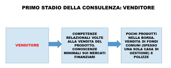 Negli anni ’802, ma soprattutto nel corso degli anni ’90, invece, si assiste al passaggio della concezione del mercato mobiliare come dimensione aspaziale e atemporale, in quanto è presente sulla rete telematica, con tutte le difficoltà di comprensione del fenomeno anche da un punto di vista strettamente giuridico. In questo contesto di continua evoluzione varia anche il prodotto-servizio fornito dagli intermediari volto a soddisfare la vera domanda del risparmiatore, in particolare del piccolo risparmiatore che più che di titoli, necessita di consulenza e di gestione del portafoglio ai fini di una massimizzazione del rendimento. Se volessimo rappresentare in qualche modo ciò che è accaduto a partire dagli anni 80 potremmo schematizzarlo in questo modo:
