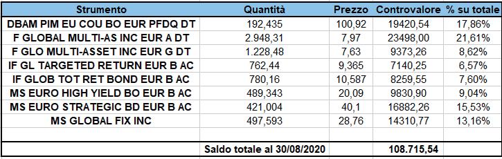 Data di riferimento 30/08/2020 portafoglio obbligazionario azzionario flessibile polizze assicurative risparmio amministrato
