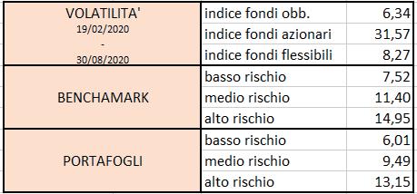 tot 19/02/2020 tot 30/08/2020 performance 19/02/2020 performance 30/08/2020 volatility (19/02/2020) volatility (30/08/2020) delta volatility max drawdown low-risk 81221,05 78957,96 4,98% -4,68% 2,32% 6,01% 178,73% -13,10% medium-risk 178598,35 166528,83 7,75% -6,28% 3,76% 9,36% 173,48% -17,75% high-risk 224409,16 213274,43 10,19% -5,10% 5,89% 13,15% 141,58% -20,65% average 169992,99 162205,48 7,38% -4,93% 3,78% 9,04% 166,77% -16,74%
