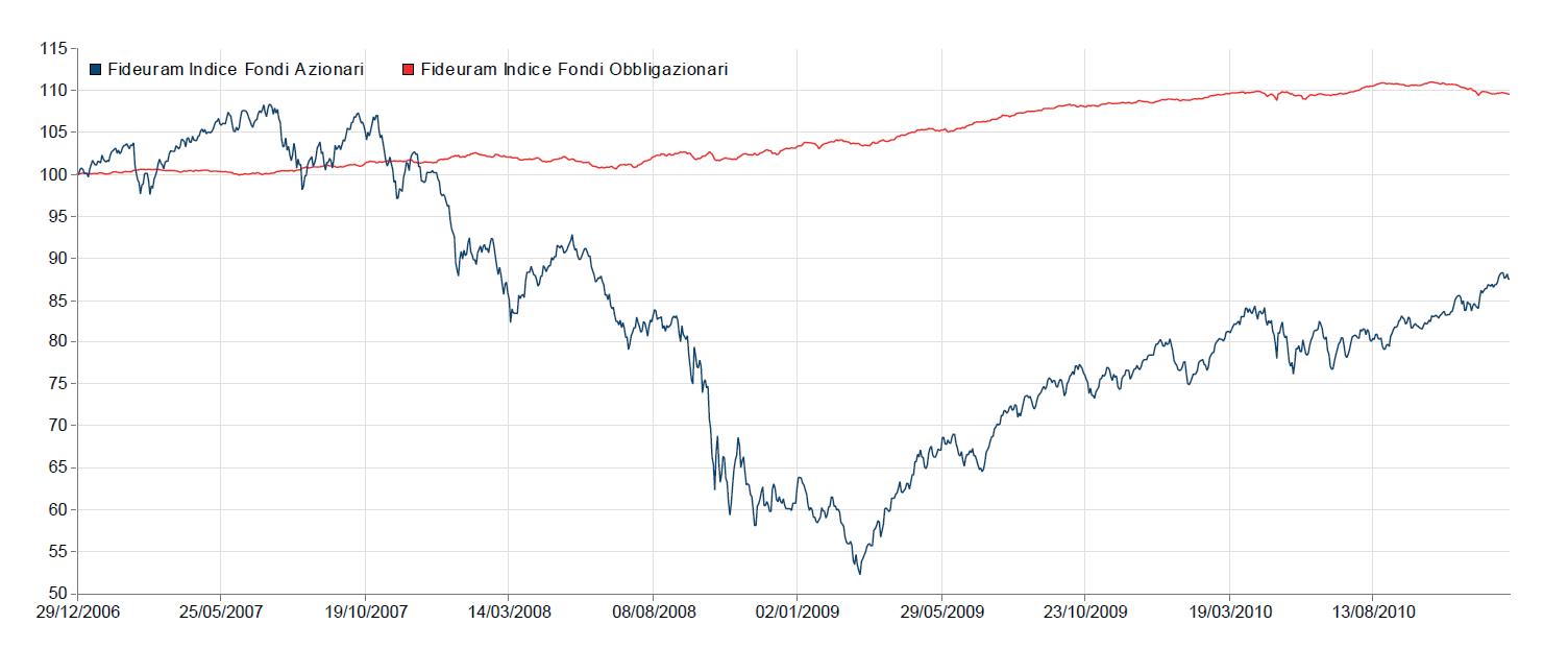 Guardando il grafico infatti notiamo che il mercato obbligazionario nel periodo compreso tra il 2007 ed il 2010 non ha risentito della crisi ed ha mantenuto un andamento crescente per tutti il lasso di tempo analizzato. Lo stesso non si può dire per il mercato azionario che al contrario ha registrato una perdita importante, che ammonta a -51.73%.