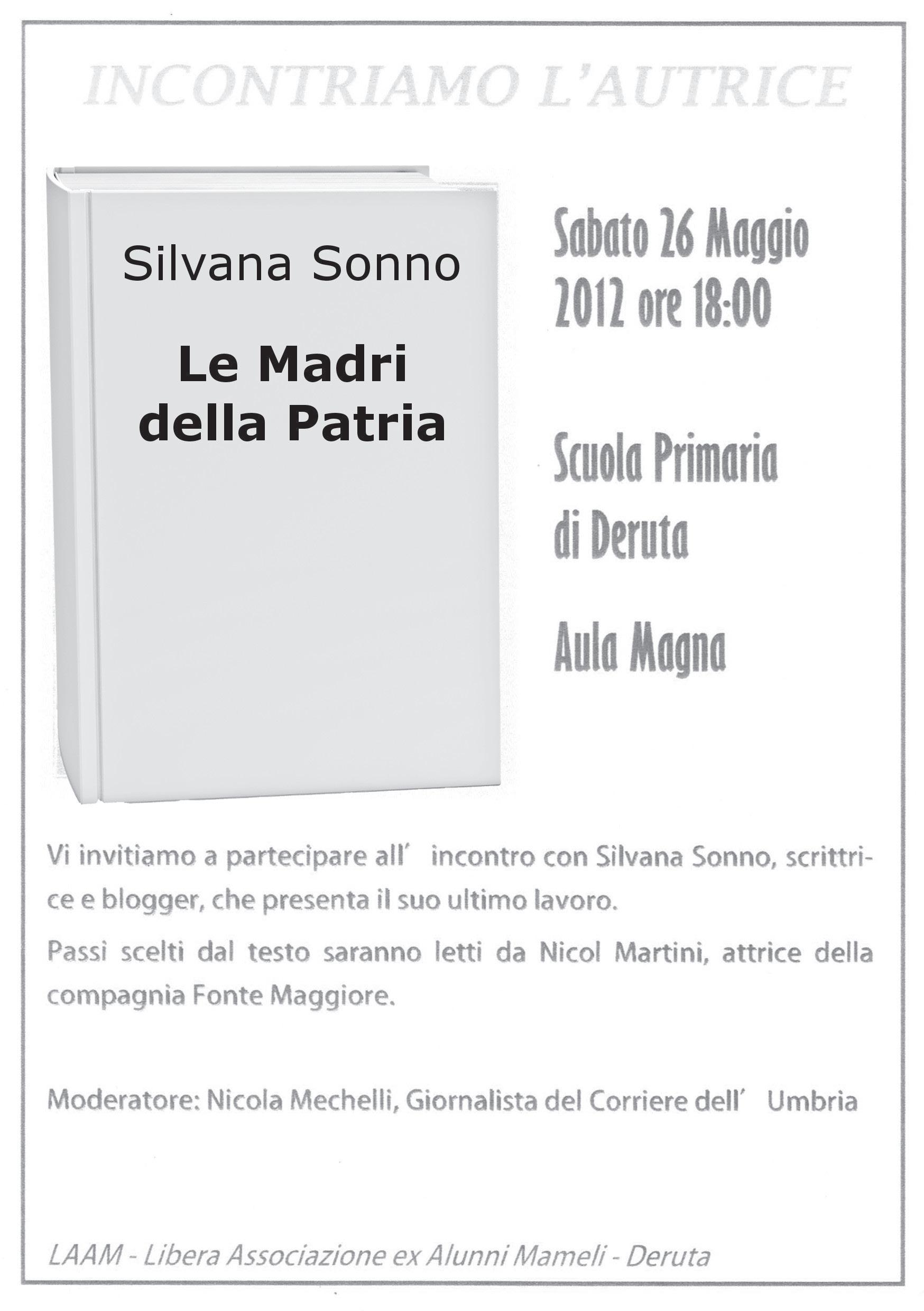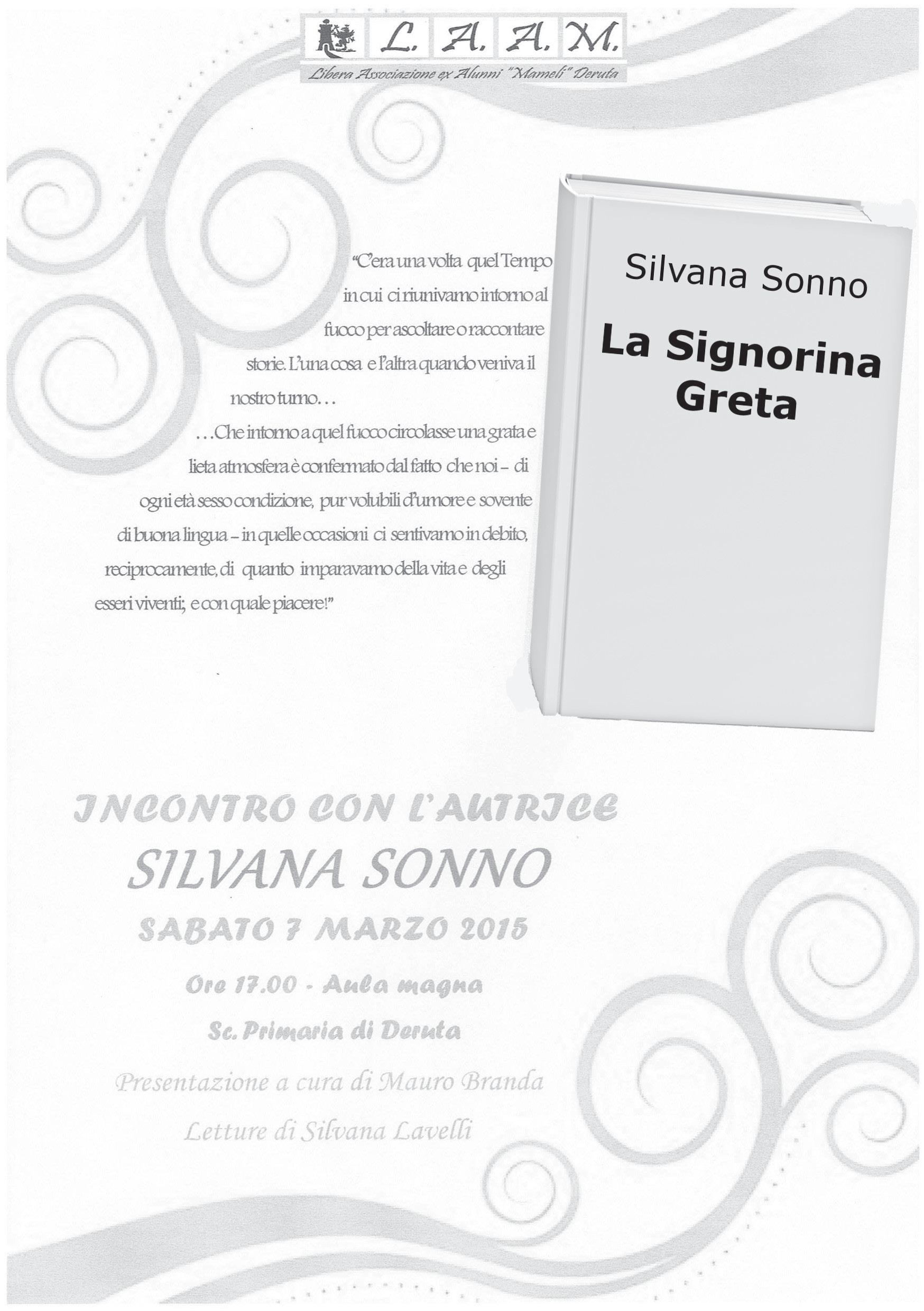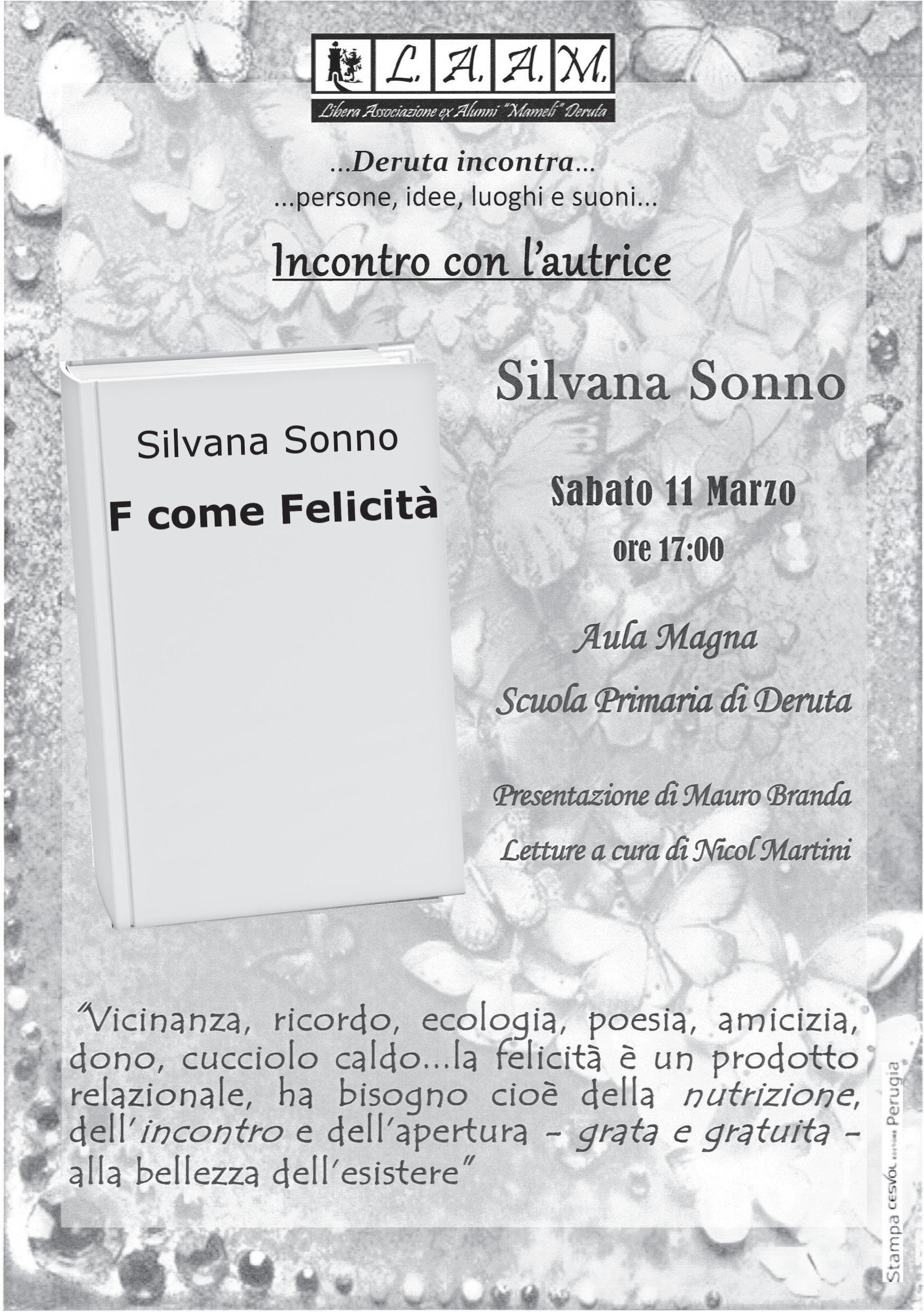 Silvana Sonno, nata a Deruta, ha vissuto a lungo a Torino dove si è occupata di educazione degli adulti nei corsi per lavoratori, “150 ore”, e per conto della Regione Piemonte.