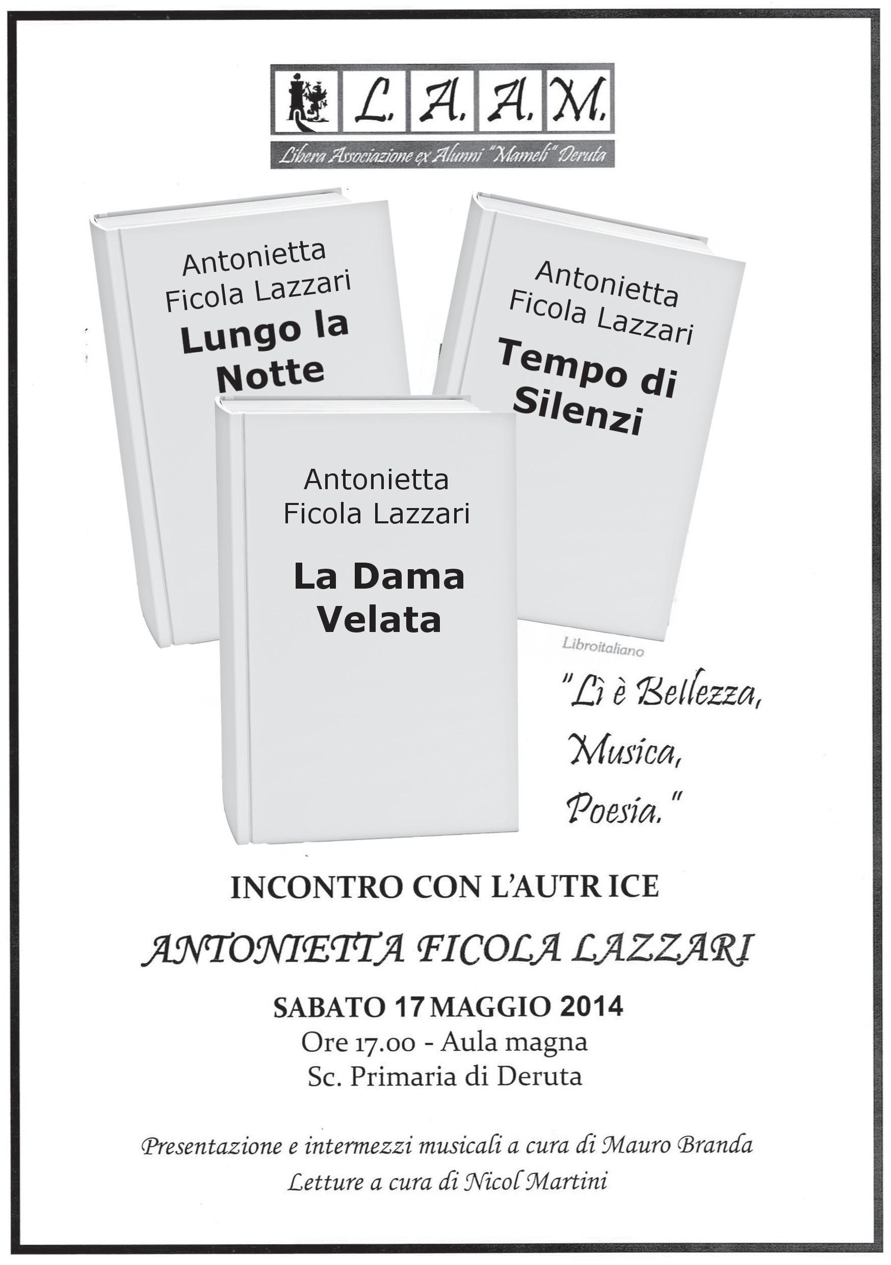 antonietta Ficola Lazzari è nata a Deruta e vive a Foligno. Ha al suo attivo diverse pubblicazioni di poesia che hanno sempre riscosso il consenso della critica. Ha ottenuto vari premi e riconoscimenti nazionali e internazionali.