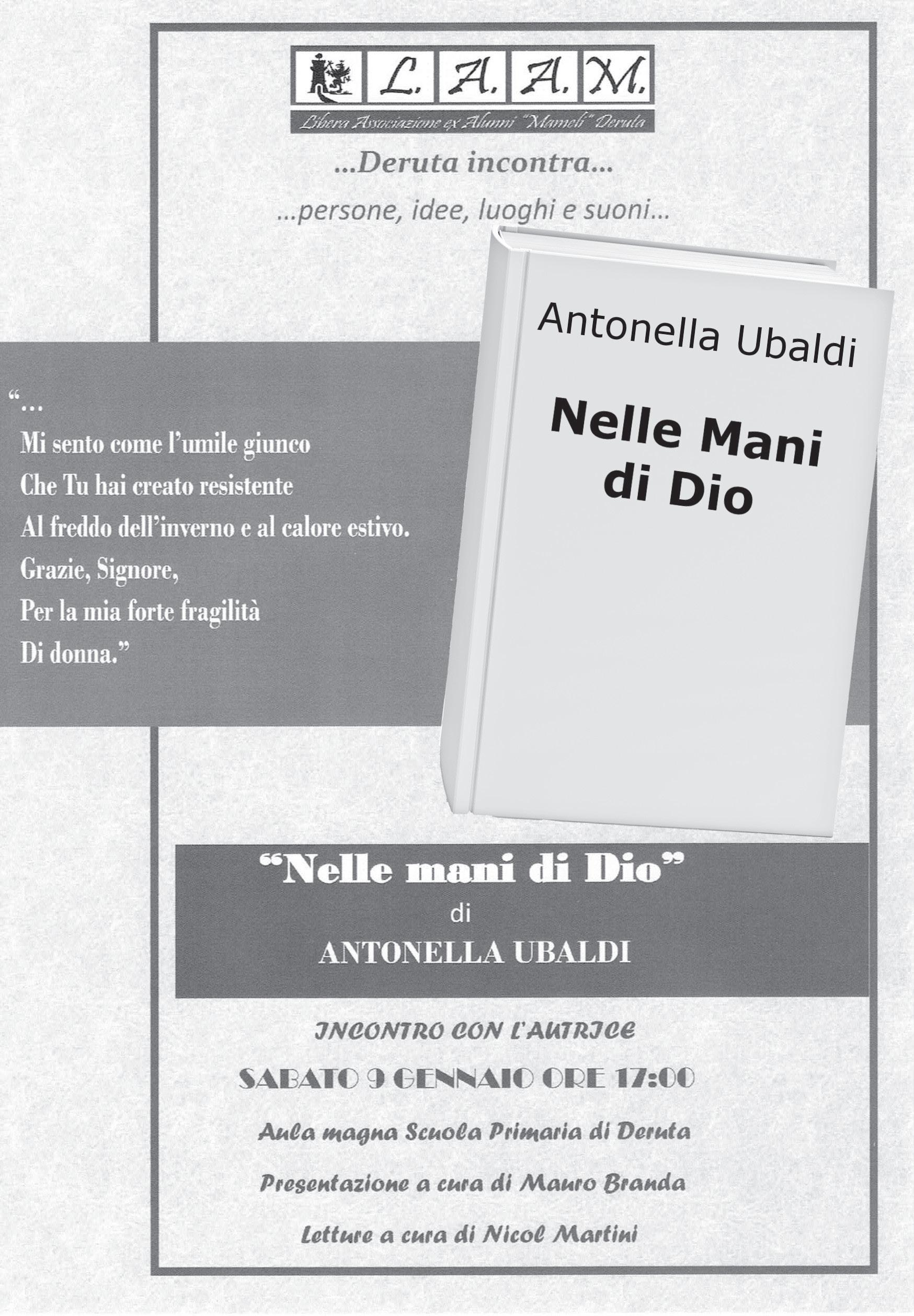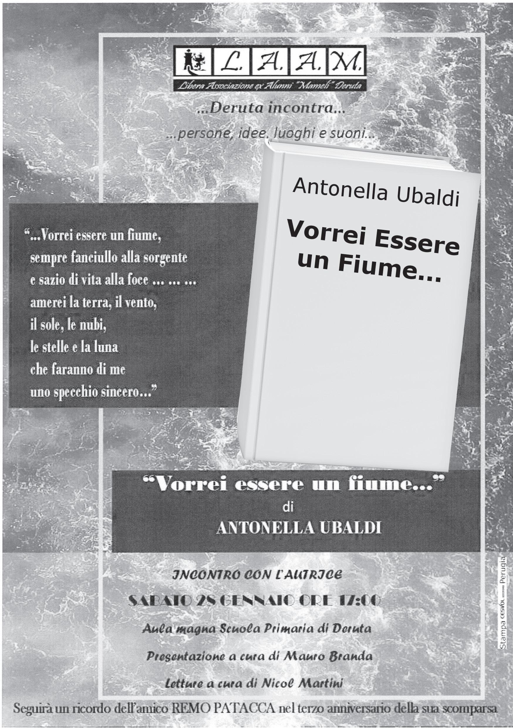 antonella Ubaldi, dirigente scolastica presso l’Istituto Comprensivo VII di Perugia, ha retto per alcuni anni anche l’Istituto Comprensivo Marconi-Mameli di Deruta. E’ studiosa di storia e profonda conoscitrice dell’opera e dei principi di Don Lorenzo Milani, che hanno ispirato fin dagli inizi la sua carriera di insegnante e dirigente. Autrice di varie raccolte di poesie composte in diversi anni a partire dal 1979 e pubblicate a più riprese fino all’anno 2014, ha scritto anche una raccolta di lettere e riflessioni dedicate al prete educatore di Barbiana, data alle stampe nel 2003 e in seconda edizione aggiornata nel 2017, in occasione del cinquantesimo anniversario dalla scomparsa di Don Milani.
