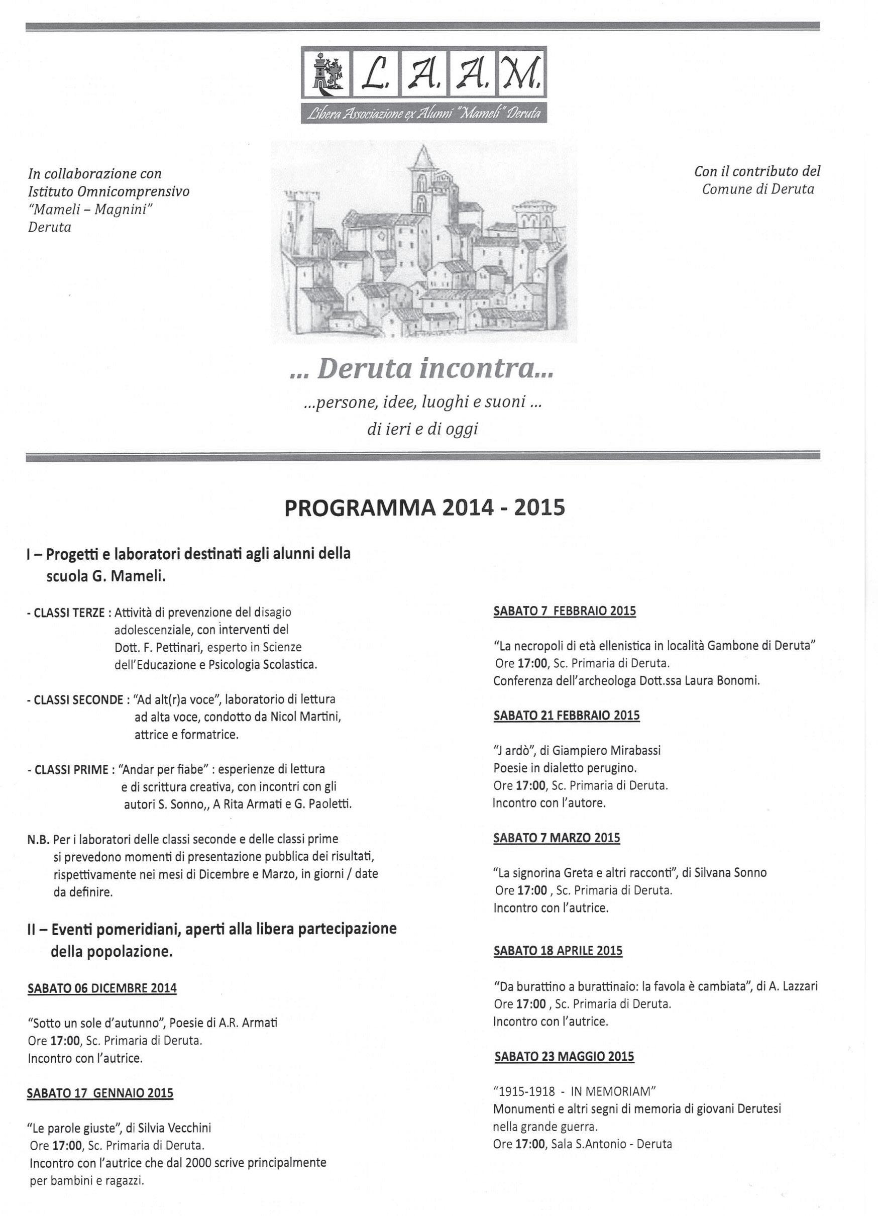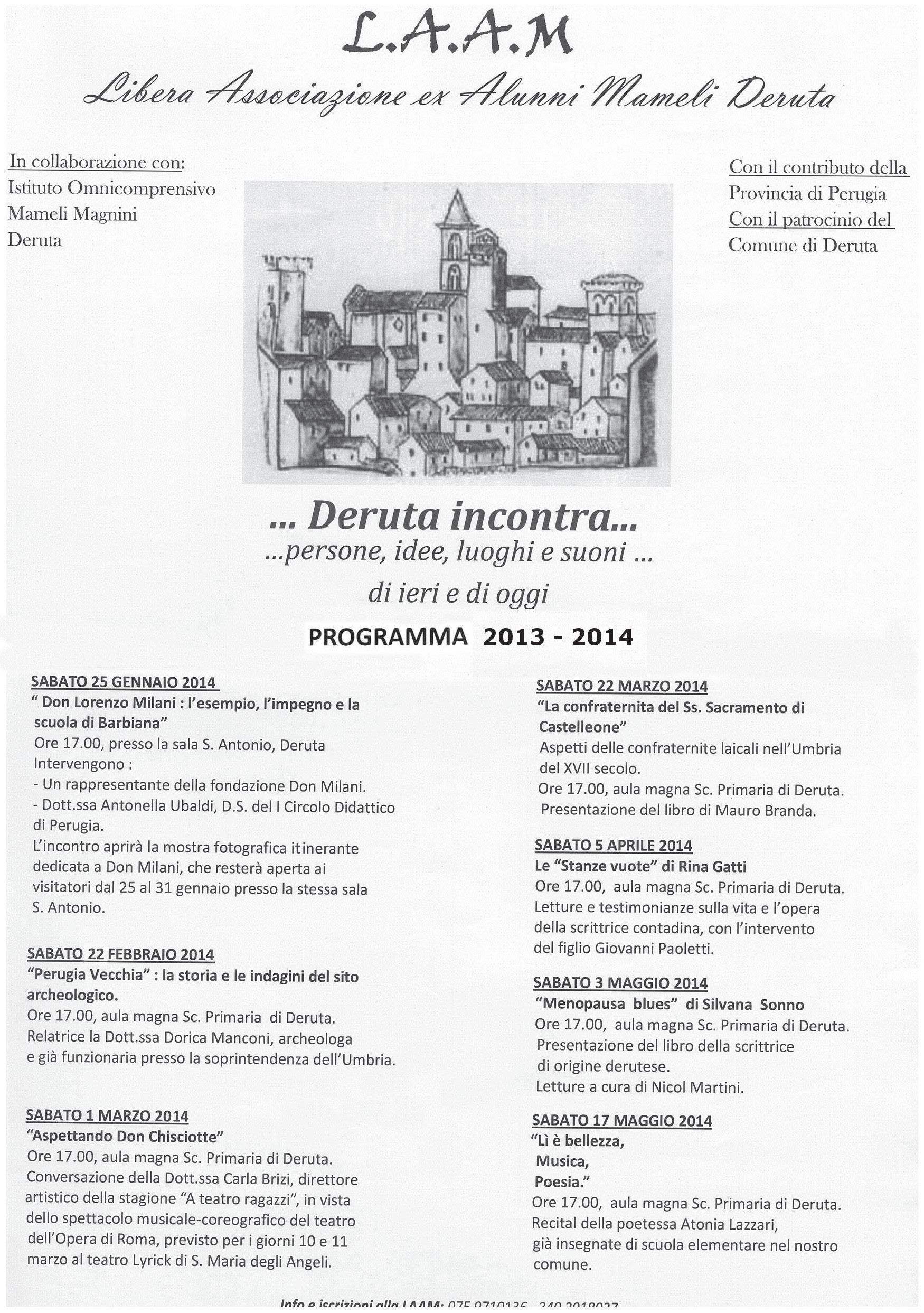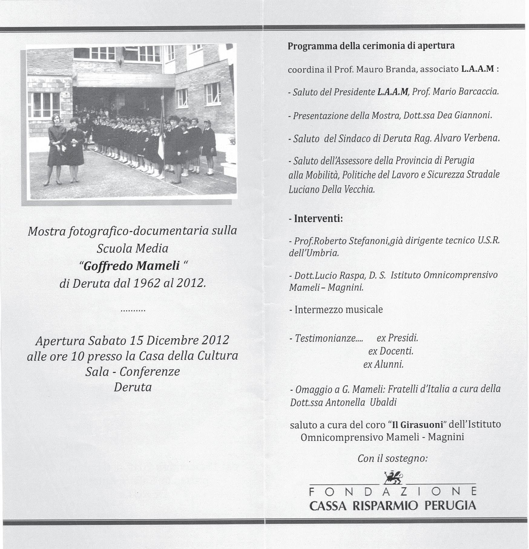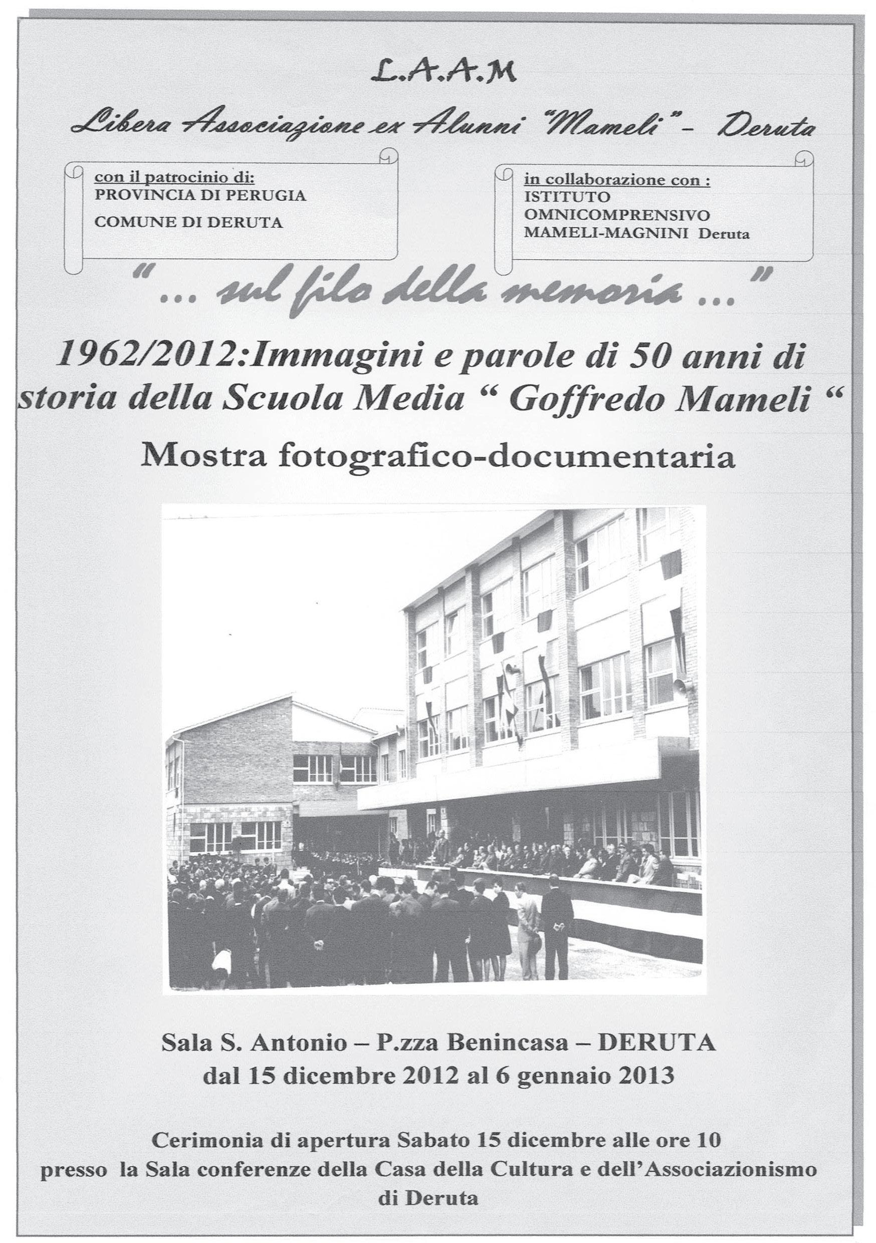 Da quando si è costituita la LAAM: Libera Associazione (ex) Alunni Mameli, ho avuto modo di collaborare più volte con i suoi fondatori e le sue fondatrici, con cui – nella quasi totalità – ho condiviso gli anni dell’infanzia e della prima giovinezza a Deruta, dove ho frequentato la scuola media nelle aule dell’Istituto “Goffredo Mameli”, allora appena inaugurato.