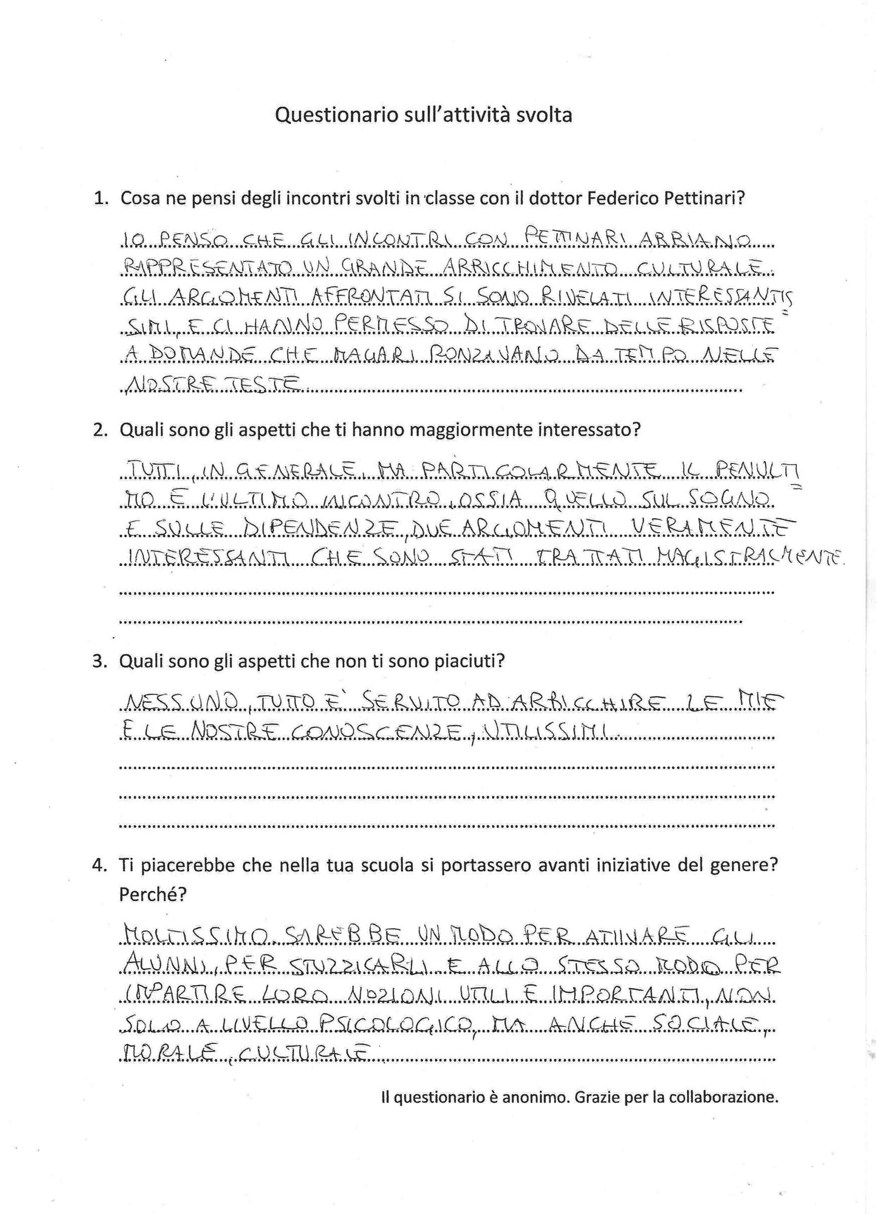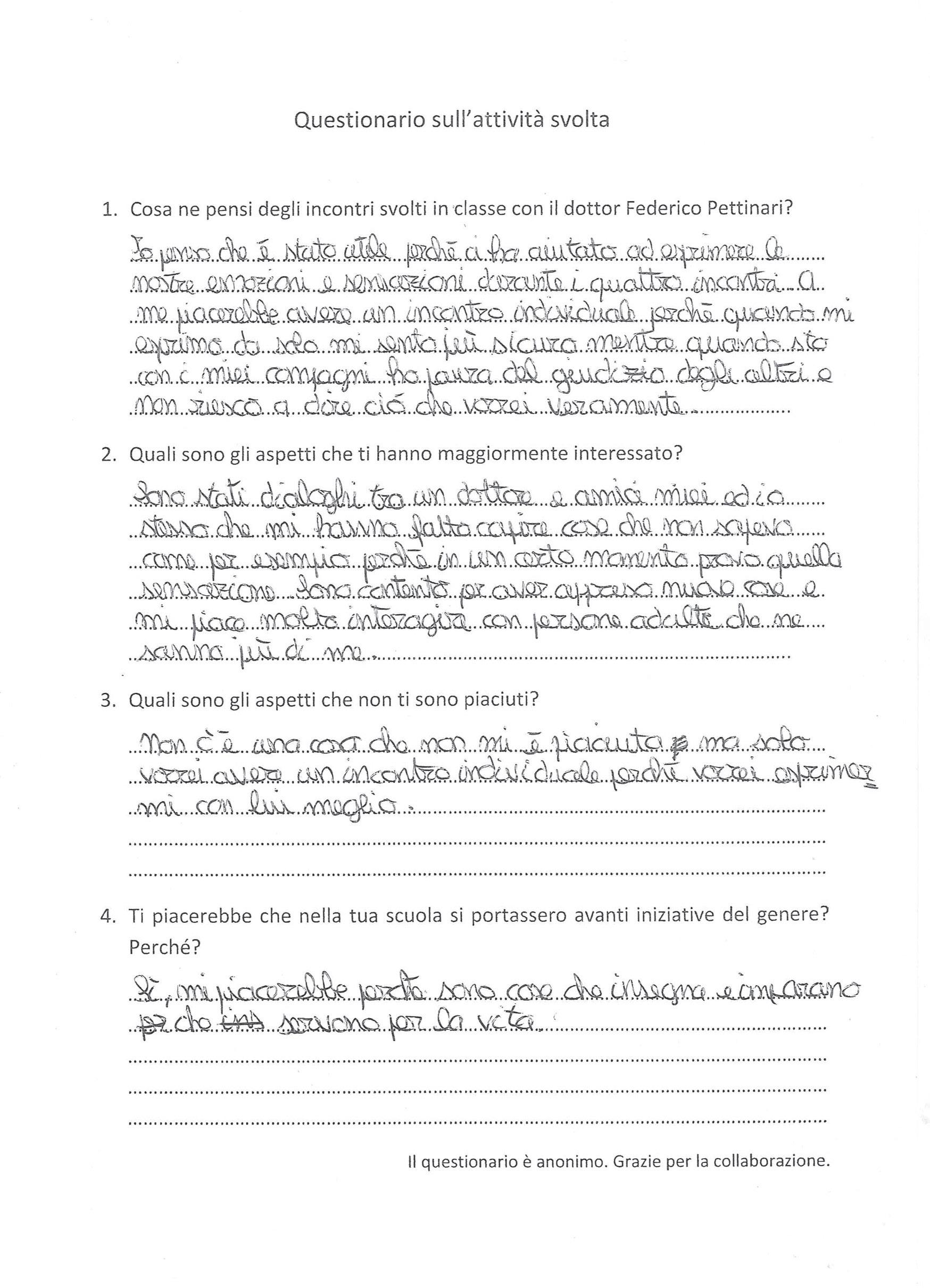 Gli interventi dello psicologo scolastico Dr. Pettinari si sono conclusi con la somministrazione di un semplice questionario che permettesse ai ragazzi di esprimere, in forma anonima, il loro pensiero e il loro giudizio sulle attività e sugli argomenti proposti. Per ragioni di spazio ne riportiamo qui di seguito solo due, che però ben rappresentano la positiva accoglienza registrata anche in tutti gli altri questionari.