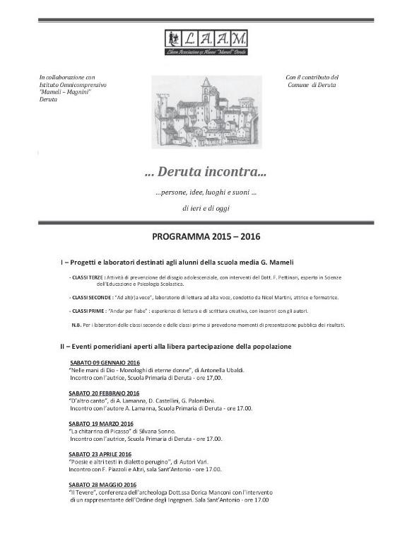 Nelle varie sezioni dell’opera si illustrano sia i progetti e i laboratori destinati agli alunni della scuola media Mameli, sia le diverse proposte rivolte alla comunità derutese tutta: presentazione di libri e incontri con gli autori, conferenze, sessioni di lettura e recitazione, mostre fotografiche, ecc.