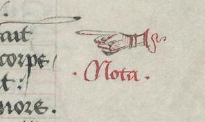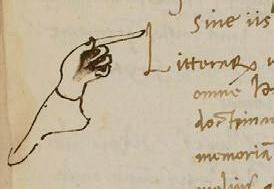 Sfogliando questo testo avrete sicuramente notato queste mani, con l’indice puntato, messe a lato di una pagina. Il nome latino di queste particolari mani è maniculae. Queste manine, di forme e grafie variegate, sono documentate soprattutto nei manoscritti medievali e rinascimentali e apposte ai margini di una pagina per mettere in evidenza una parte specifica del testo. La manicula è la pioniera dell’odierno evidenziatore.