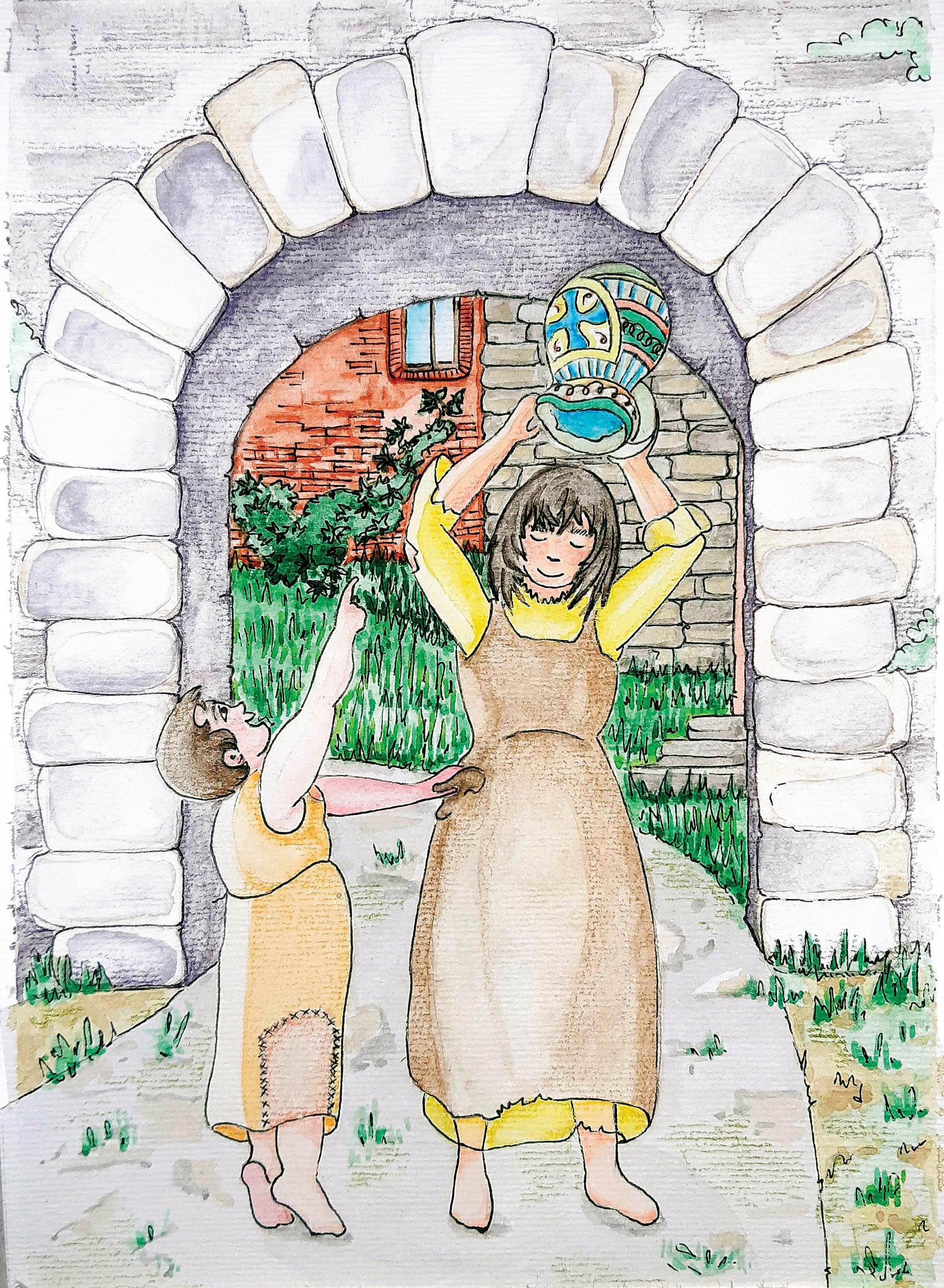 E così feci. Tuffai la brocca in acqua, aspettai che si riempisse fino all’orlo e la risollevai dalla cavità lentamente con entrambe le mani, tanto pesava. Con attenzione la rovesciai, timorosa che si svuotasse a terra in un attimo, ma non accadde. Portai quindi la brocca sottosopra e lentamente sulla nuca. L’imboccatura magicamente tratteneva l’acqua, e mi avviai in anticipo verso il castello.