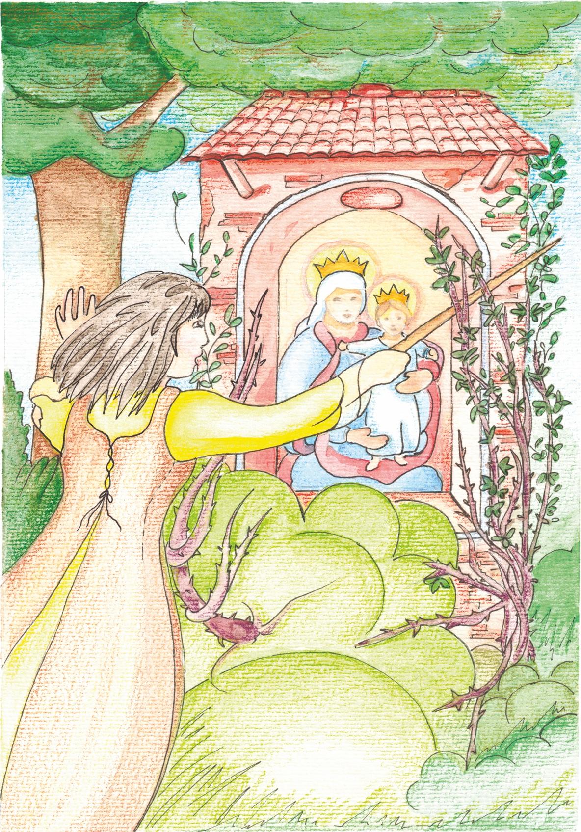 Quella sera gli abitanti del castello entrarono in fermento. Anche se ormai stava calando il sole, il parroco afferrò un candeliere e andò all’istante sul posto, per valutare in prima persona le condizioni dell’edicola. Scoprii così che la casetta era un’antica cappella viaria, di quelle che si incontrano spesso lungo le strade e al cui interno è dipinta l’immagine di una Madonna con il Bambino.