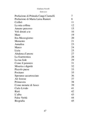 Prefazione di Primula Cangi Ciurnelli Prefazione di Maria Luisa Ranieri Colibrì La mia collina Ameno percorso Voli dorati a te Mare Era Mezzogiorno Memento Annalisa Marco Licia Altalena d’amore La fisarmonica La tua fede Come il pensiero Miseria e dignità Piccolo paese Positano Speranze accartocciate Ali festose Primavera Come monete di fuoco Cielo Livido Rieti L’alba False Verità Biografia