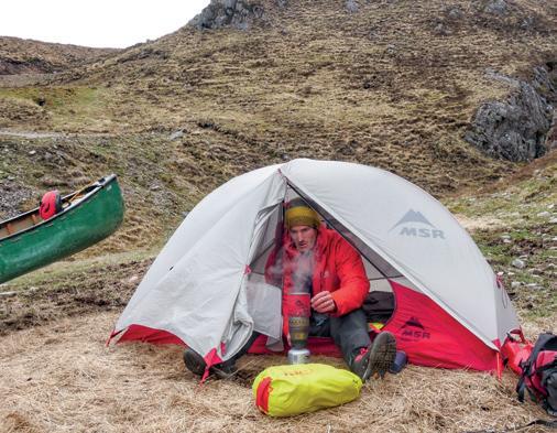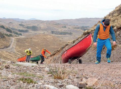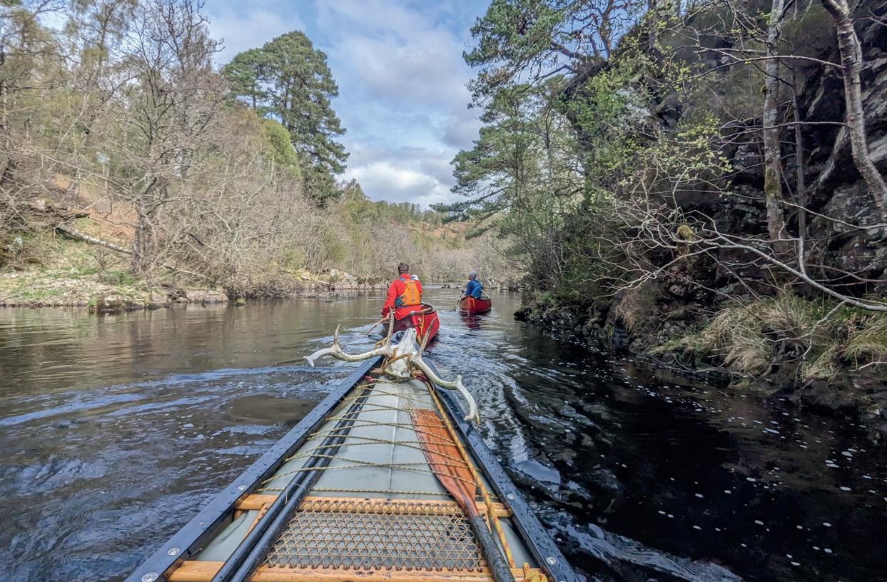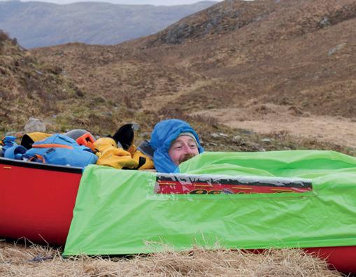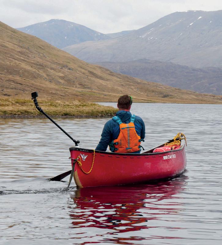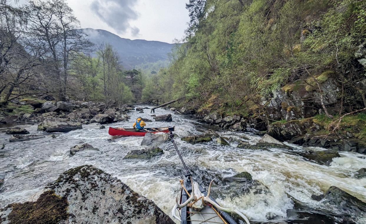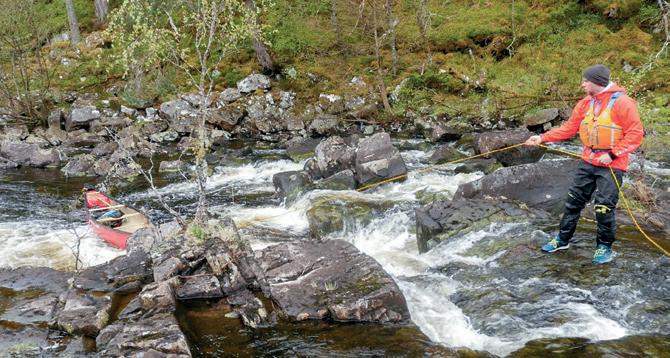 handle a trad boat. He made it down the drop, swamping the canoe and filling it to the gunnels. He missed the exit and was being pulled back into the recirculation of the drop. Tempted to keep filming, I ditched the camera and grabbed his painter to ensure he didn’t swim and lose any kit.