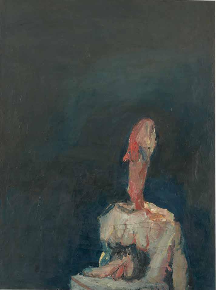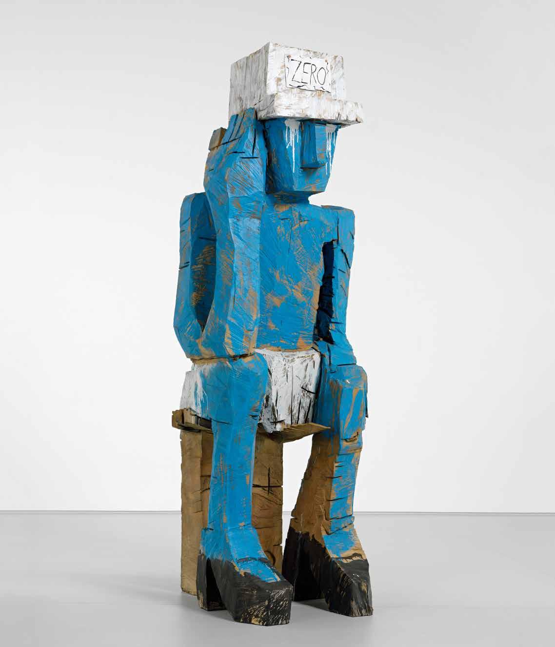 The word “zero” sounds harsher than the German Null or Nichts. Baselitz had himself photographed holding a piece of paper with “zero” written on it. He is wearing a cap with the word on it, which looks strikingly similar to a self-portrait sculpture. In contrast to artists who are fascinated, obsessed, even, by death and endings, such as Edvard Munch, Max Beckmann, later Joseph Beuys, Andy Warhol, or Markus Lüpertz, reflection on transience and decay only appeared in Baselitz’s oeuvre a few years ago: Davongehen, Weggucken, Abgehen or Ohne Hemd auf der Matratze liegen are two paintings from 2015. Soon after Baselitz painted them, he painted a female nude, Abwärts III, who is bathed in the same sallow, unrealistic color. In this painting, the orientation of the motif corresponds to the iconographic meaning of reflections about his own fragility and approaching death. In opposition to earlier representations of violence, pain, or injury, the bodies now seem to disappear into the pictorial space because the extremities dissolve. In the paintings with the “Zero” attribute, self-mockery comes into play. By not shying away from representations like Abwärts III (2016), Baselitz not only shows how it is or will be, but he also demonstrates sovereignty opposed with fears and painful experiences of the body. The colors in this group of works are reminiscent of a stage left mostly dark; it could be the set of a Samuel Beckett play, whom Baselitz met while Beckett was in Berlin. Self-mockery is also present in the use of the Italian word “Zero” because it has to do with casinos, which can also be a stage for human fate. But zero is also a recurrent challenge for an artist who must keep reinventing himself from zero. The loneliness and isolation of the young artist in West Berlin was the first and unforgettable “zero” experience for Baselitz. His oeuvre since then has been frequently structured by “zero” situations that were resolved by reflection and willpower. Baselitz proceeded in a similar way to his friend A. R. Penck, who closely studied Picasso’s many stylistic changes. However, a hint of resignation may also be mixed in with the “Zero” attitude, something of the melancholia of completion. In his late years, Eugène Delacroix painted Michelangelo sitting deep in thought in his studio amongst his famous figures. It displays Delacroix’s own mental state in the mirror of a great predecessor. But from this melancholia of mastery, from this zero, new unique works emerge. In the photo of Baselitz holding the “zero” note, he is smiling.