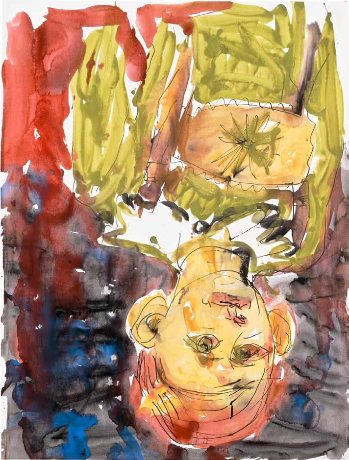 After the reunification of Germany, Baselitz depicted a panorama of women coming home in 45, entering a streetscape from a distant Saxon landscape. Later Baselitz would create the yellow heads of the Dresdner Frauen . None of this is directly linked to the “Orange Eater,” but it is, nonetheless, part of its history. While the motifs in Straßenbild (1980) are located both in the present and past, in the Orangenesser and Trinker series from the beginning of the 1980s, Baselitz reacted to his artistic environment. Not least of all, through his turn to more expressiveness after the cool colors in his work from the late seventies in the exhibition in Eindhoven, a new, aggressive color palette emerged, which was sometimes excessively garish. Eating and drinking, both basic necessities of human life, became his theme in extreme formulations. By enhancing the most banal objects