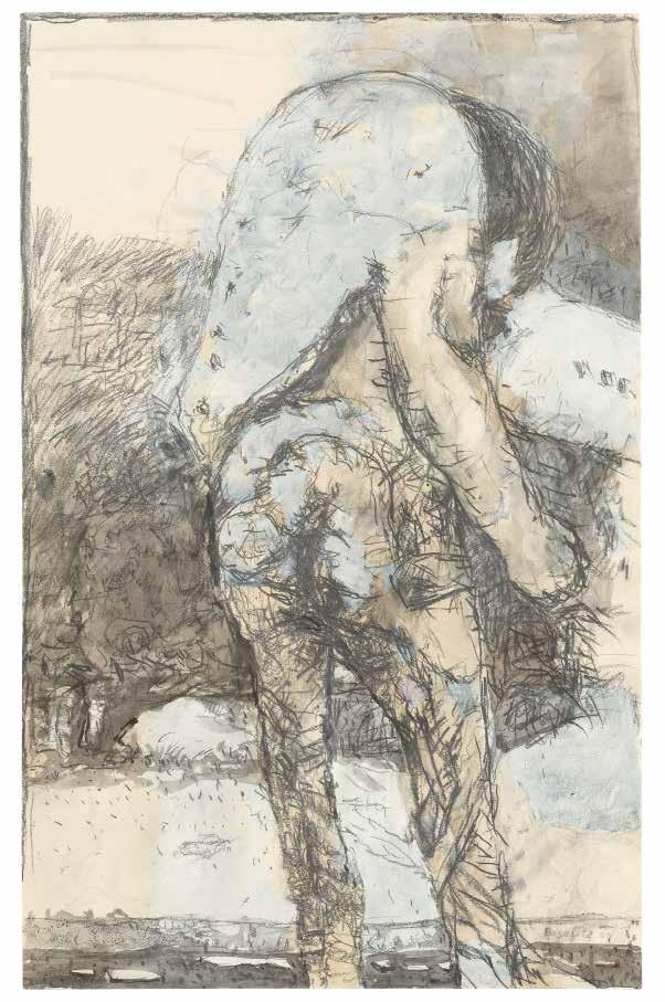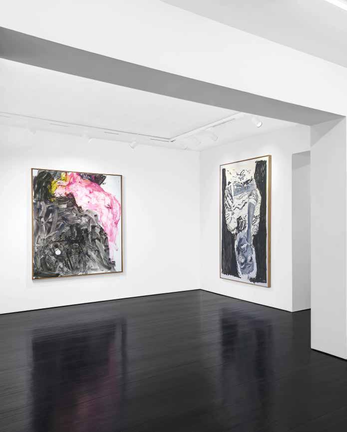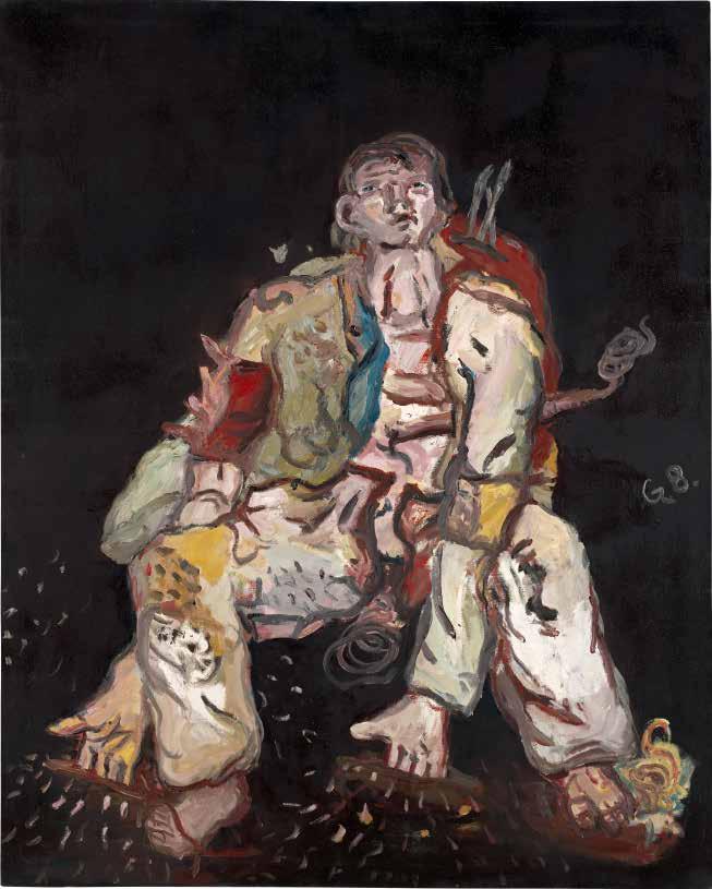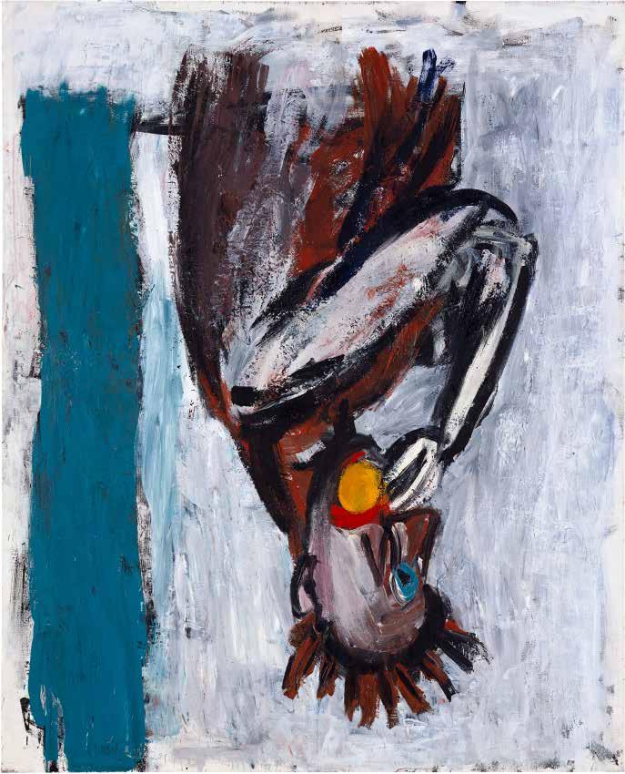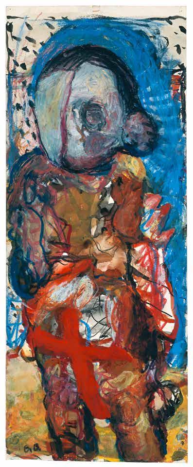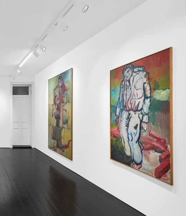 inventions were met with very little response at the time of their creation. But with his fictive heroes or “new guys,” Baselitz found formulations for the discomfort that registered with alert artists and writers, despite the glittering consumerist surface of West Germany. During these years, which seemed to be without history, paintings like these visualized what had been suppressed in the German situation between the Third Reich, division, and the future. The modern painter cannot forget anything; in Baselitz’s case, he remains stuck in his connection to his country. The principle of division painfully dominates the final painting of the heroes phase, namely the rift in Die Großen Freunde (1966).