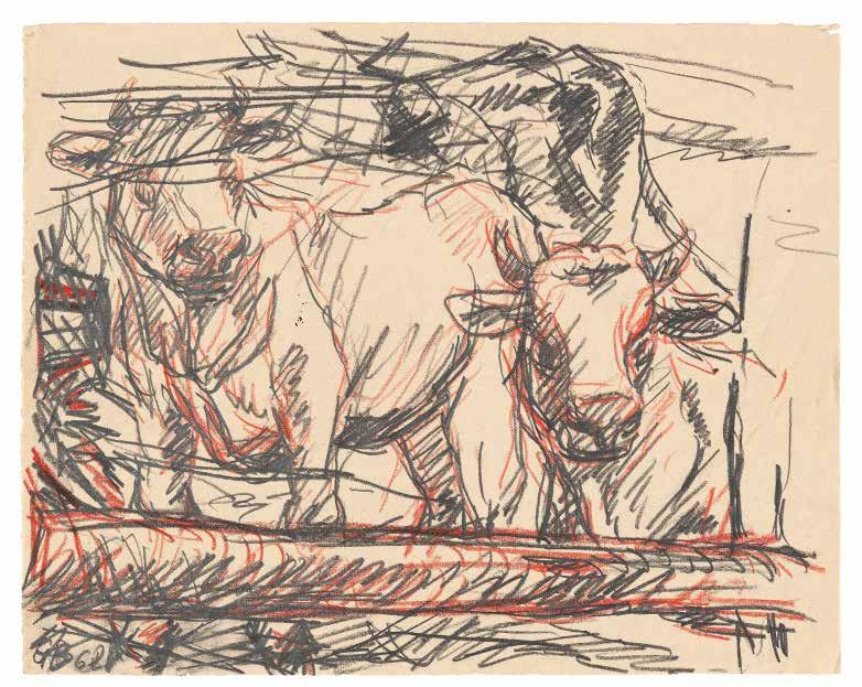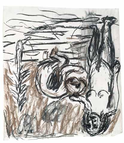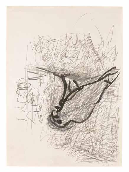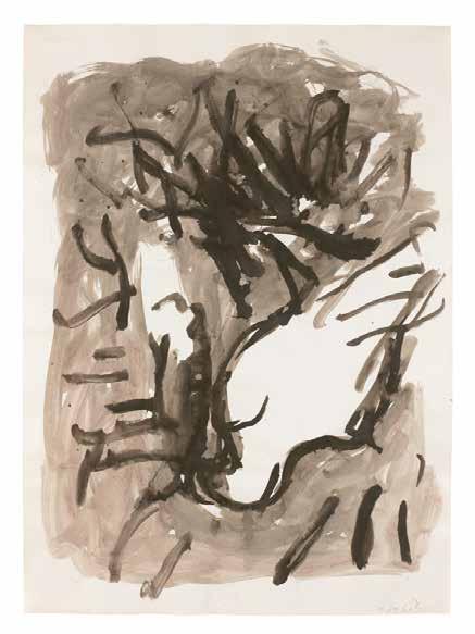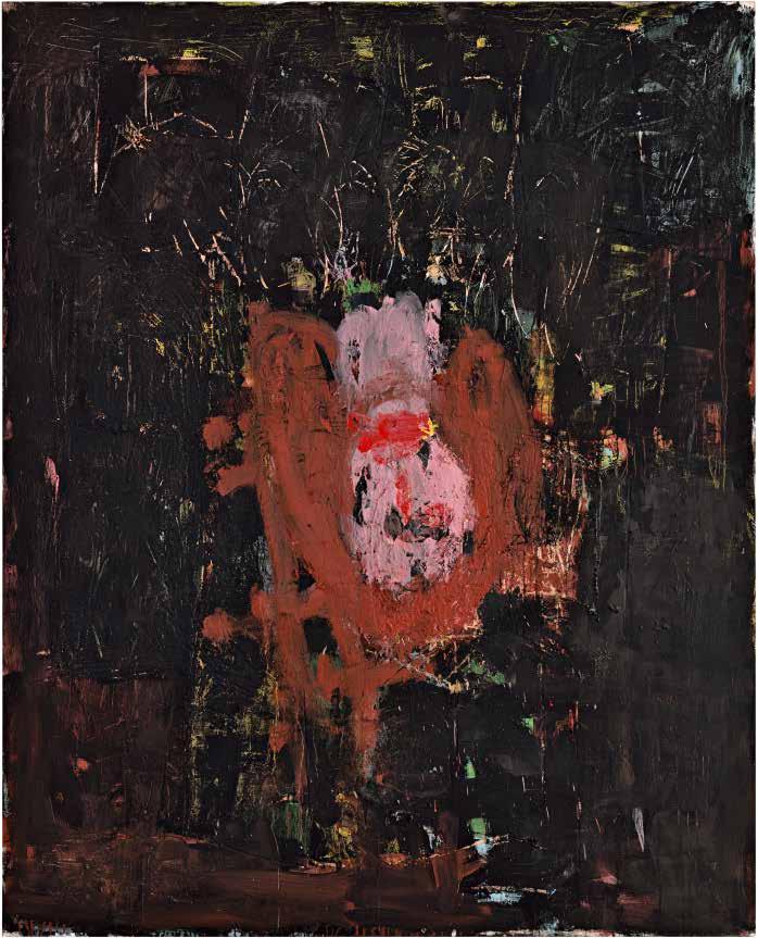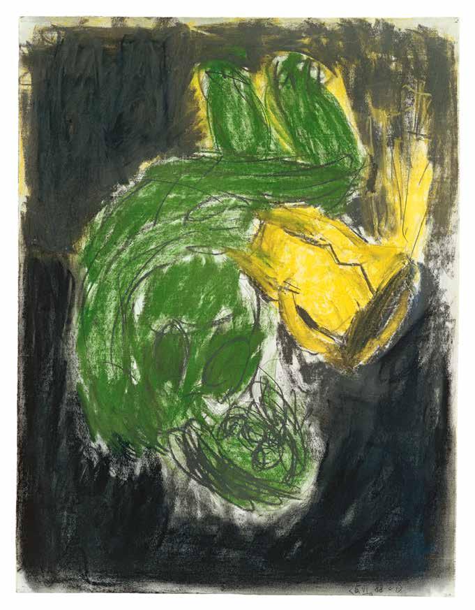 and actions with such crudeness and anger, Baselitz responded to the emerging work of the “Neue Wilde,” as it was christened by critics alluding to the historical group of the Fauves in Paris around 1906. Baselitz’s painting style in subsequent years did not just cultivate the crude, but also the ugly. This became a leitmotif of the decade following 1980. Baselitz found a way to produce provocative paintings without working with irony, parody, or political provocation, but rather with an elementary kind of painting, demonstrated with elementary processes of life. The motifs of oranges and drinking glasses could be studied at length; the rare citrus fruits of the GDR , the despairing drinking of the bohemians would offer plenty of material. But in their immediacy and crudeness, these motifs also reflect the intellectual and experimental exertion at the beginning of a new period in his work.