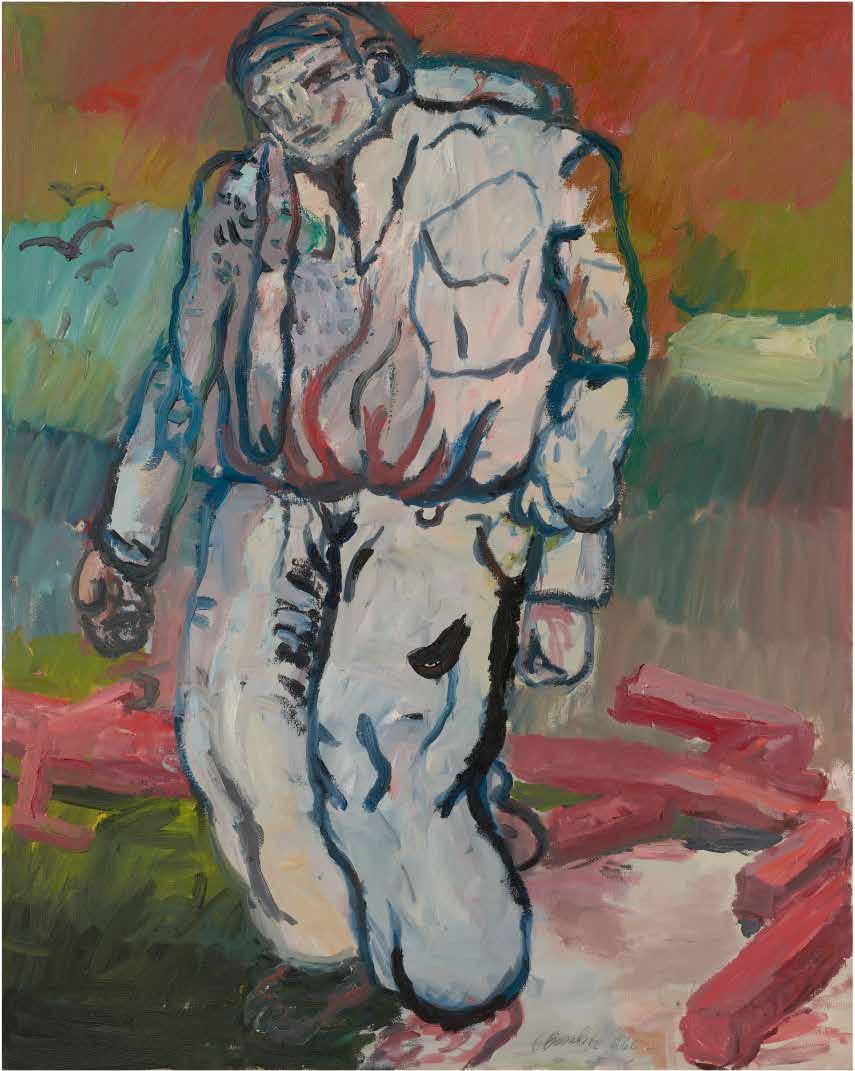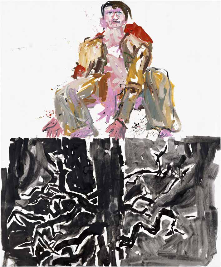 Heroes series of Helden paintings, which Baselitz completed and 1966, is the work Ein moderner Maler, in which figure appears sitting before a black background on his hands trapped in crevices. The torn clothes have once served as a soldier’s uniform. Seized, the sky tormentedly, lost in a no-man’s land, does not correspond to a traditional notion of Since antiquity, people with extraordinary mental physical powers were considered heroes. They were considered role models, but they were also always used mobilize the energy of individuals, people, and states, in times of crisis or war. After the Second World a notion of heroes became untenable in West and even the term “hero” disappeared from long time. This was different in the GDR , new category “hero of labor” was introduced. Baselitz’s figures have nothing to do with either the or Eastern notion of heroes. Even though they self-portraits, the artist reflected on his position East and West, past and present, which he experienced as an outsider. In the middle of the economic West Germany, these paintings, with their injured, helpless creatures, could not help alien and disturbing. Consequently, these