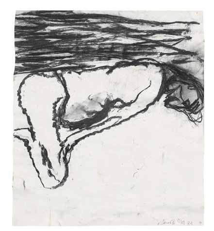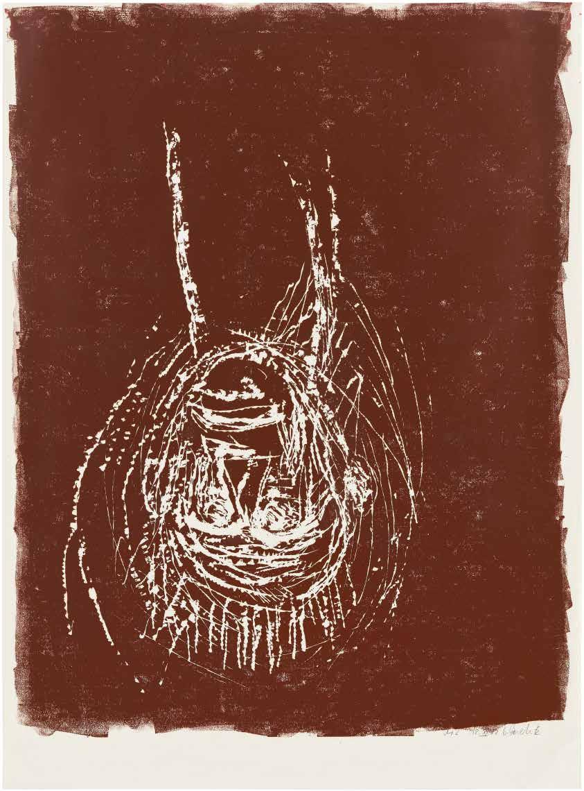 political changes of 1989. Under the impression of this moving historical moment, Baselitz began a multi-part work on wooden panels. These panels were stained black and treated in the style of the large linocuts, though, due to the material’s brittleness, in a particularly rough manner, and were to display women’s heads. One panel shows a rabbit. The work culminates in twenty pictures in a wall-sized composition, arranged in two vertical rows. Only the succinct title 45 alludes to the historical reflection associated with this ensemble. Bild Nr. 21 was granted status as an individual work. When the Second World War ended in 1945, women were faced with a harsh reality in a devastated country. At that time, Hans Georg Kern was seven years old and he experienced the historical changes as a transition from dictatorship and war to a completely unstable and disoriented present. By adding the rabbit to the cycle, the symbol for erraticness and exposure, Baselitz alluded to how he experienced life at that time. Although the women’s heads seem simplistic at first glance, upon longer examination a broad spectrum of human emotions becomes visible.