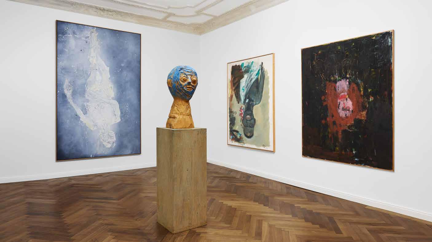From this mysterious coexistence, Baselitz created a polyptych in 1989/90 called 45, which has twenty wooden panels that were roughly treated in the manner of his sculptures. Because the individual pictorial fields give the impression of windows, there is the sense of being in front of openings where there is no greeting, screaming, ranting, or even simple conversation. Sometimes only a head appears, as if it had just been invented – raw, immediate, like a blank slate that could soon expand.
