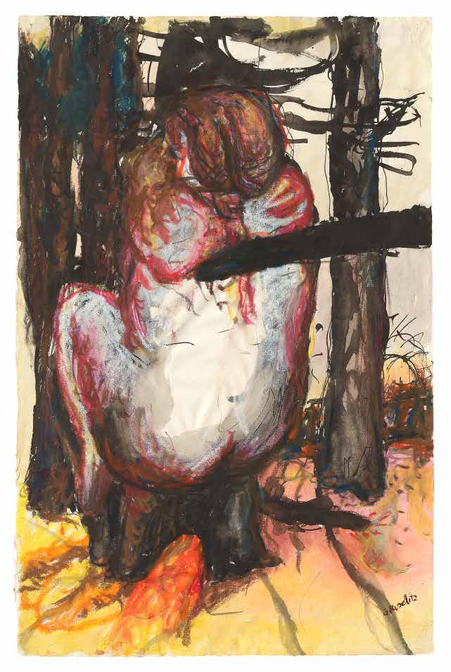 Baselitz’s use of the dark background and his rough treatment of the wooden panels enabled him to develop something out of nothing, the reemergence of humans after a catastrophe. As in some works from the 1980s, the mother/child motifs, for example, Baselitz consciously used ugliness as a stylistic device to avoid any detachment when looking at history. Baselitz achieved an appropriate pictorial realization not through historic argument or allegorization, but rather through direct, unvarnished confrontation with the memory of 1945. In titling the work 45 Bild Nr. 21, Baselitz hinted that he might not have exhausted this topic yet, demonstrated by the yellow wooden sculptures, Dresdner Frauen , from 1990.