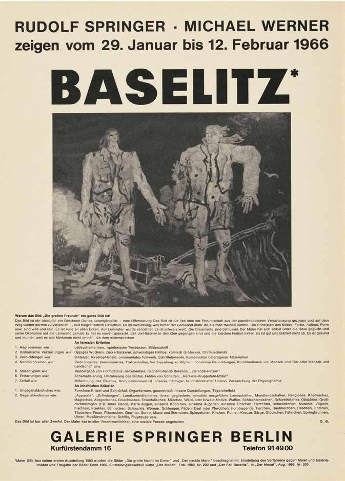 Als Baselitz 1966 für das Plakat seiner Ausstellung in der Galerie Rudolf Springer in Berlin ein Manifest verfasste, hatte sich der Gestus verändert: „Warum das Bild ,Die großen Freunde‘ ein gutes Bild ist.“ Nach den Erfahrungen mit der skandalhaften Wirkung seiner ersten Ausstellung 1963 nahm Baselitz das Existenzielle zurück. Er schrieb dem Bild ironisch die Merkmale zu, die Hans Prinzhorn als Eigenart der „Kunst der Geisteskranken“ herausgearbeitet hatte.