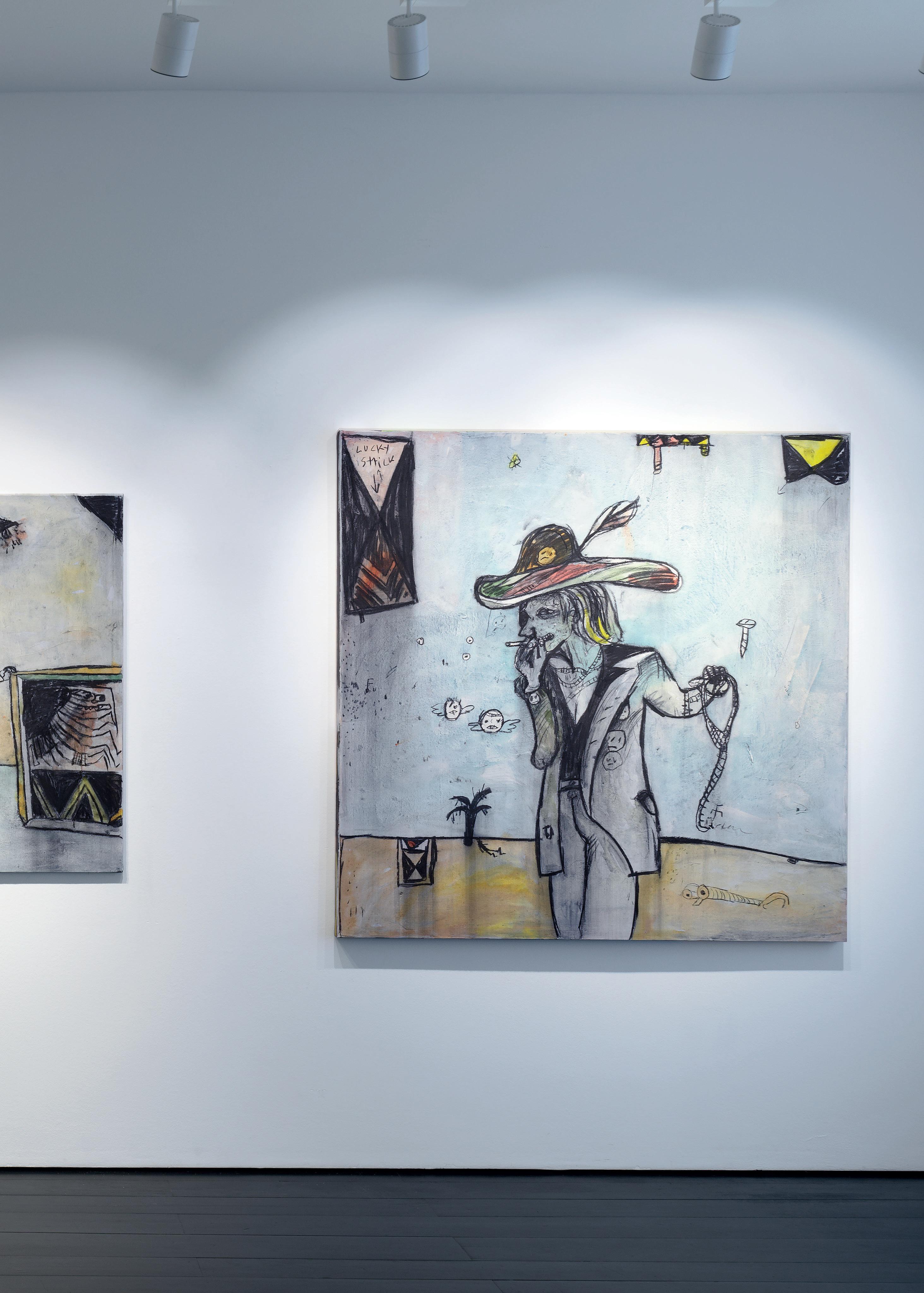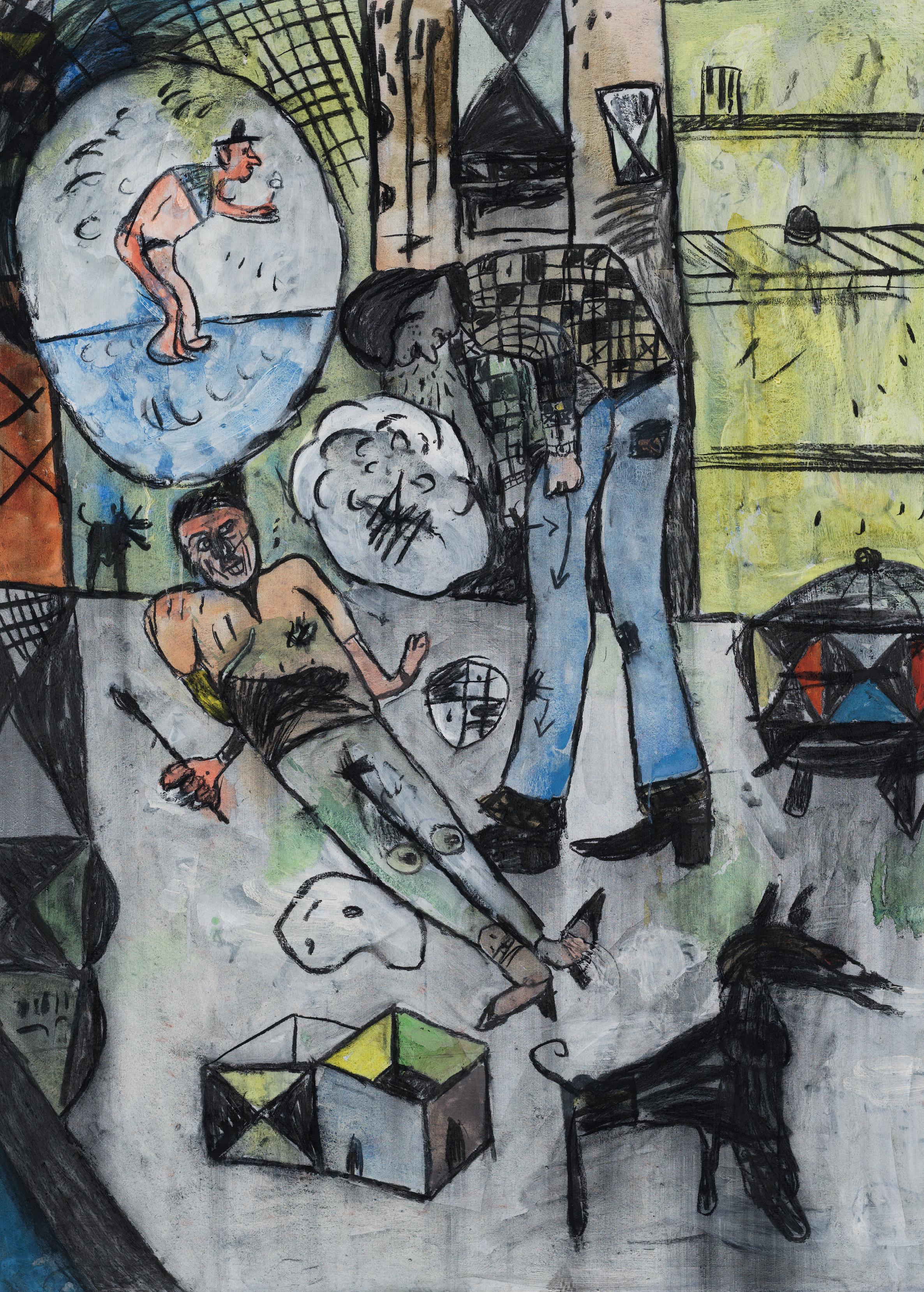Scattered around the compositions are things or animals, sometimes symbols. Some are clearly recognizable, e.g. a turtle, cats, dogs, skulls, guns, palm trees, numbers. Others remain enigmatic, e.g. geometric shapes, grids, arrows, graffiti, squiggles, etc. All these attributes suggest stories, but they are not told. Therefore, the status of the images remains vague. Are the scenes set in the present time or is the viewer looking into a miserable future? Both are conceivable, reality and ima gination are intertwined. Are the images meant to banish the miserable or rather to conjure it up? That remains unanswered. For the painter, the attributes open up a space of imagination. They recall situations, other art, experiences, etc. To the viewer, they can provide a welcome distraction to drill his eyes, so to speak, into the walls, floors, walls, even bodies. The artist seduces the viewer’s gaze into the criminal.
