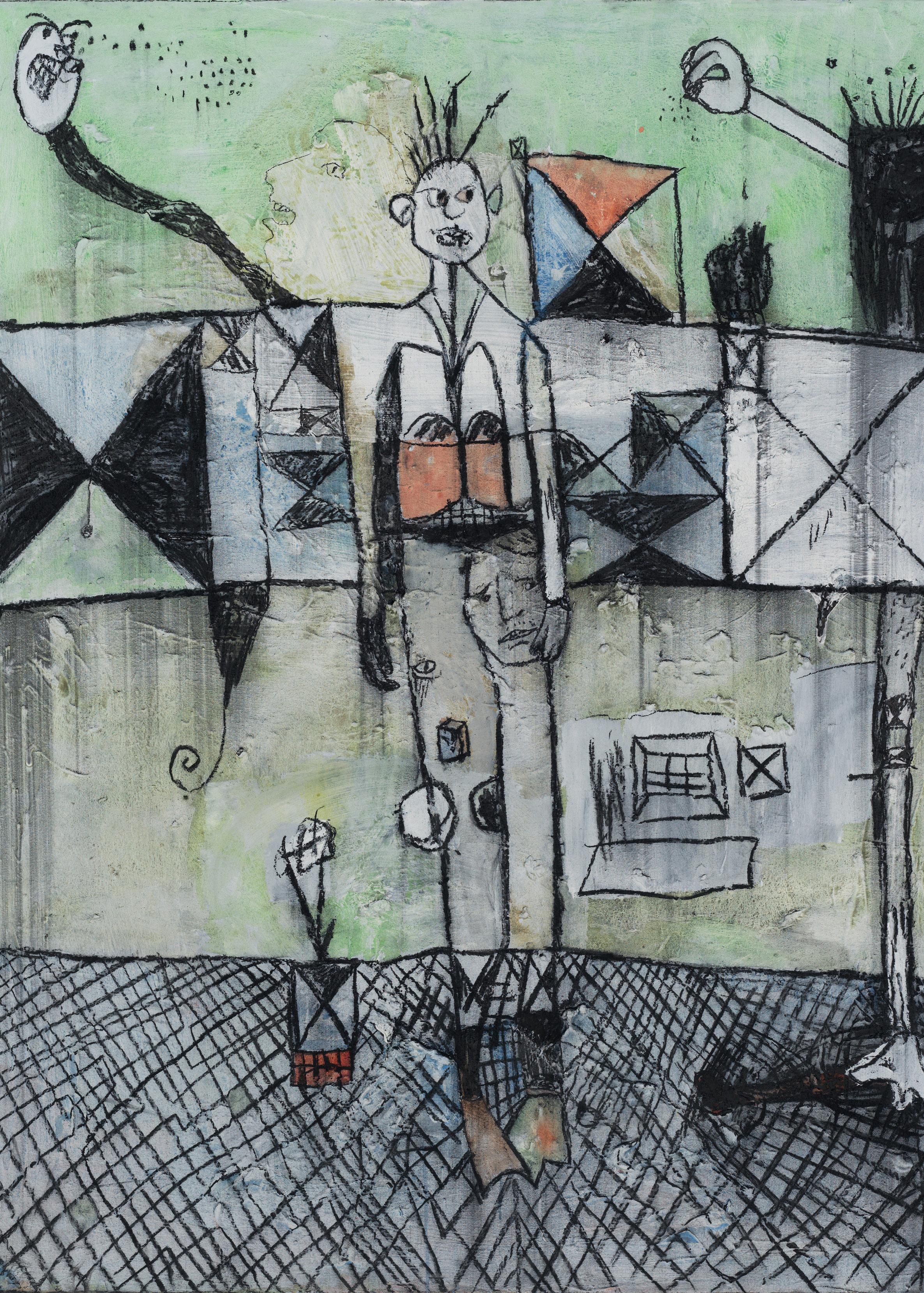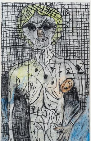 This family of precarious existences is brought about with the means of the drawing. Many variations of the charcoal line are used. There is delicate blue, pink or bright yellow. Although a reality appears, the works are not realistic, but they seem to have sprung from a fantasy, an imagination that never theless emanates from experience. This has a repertoire of grotesque, ugly, caricatured details, but without wit or mockery.