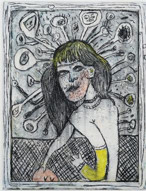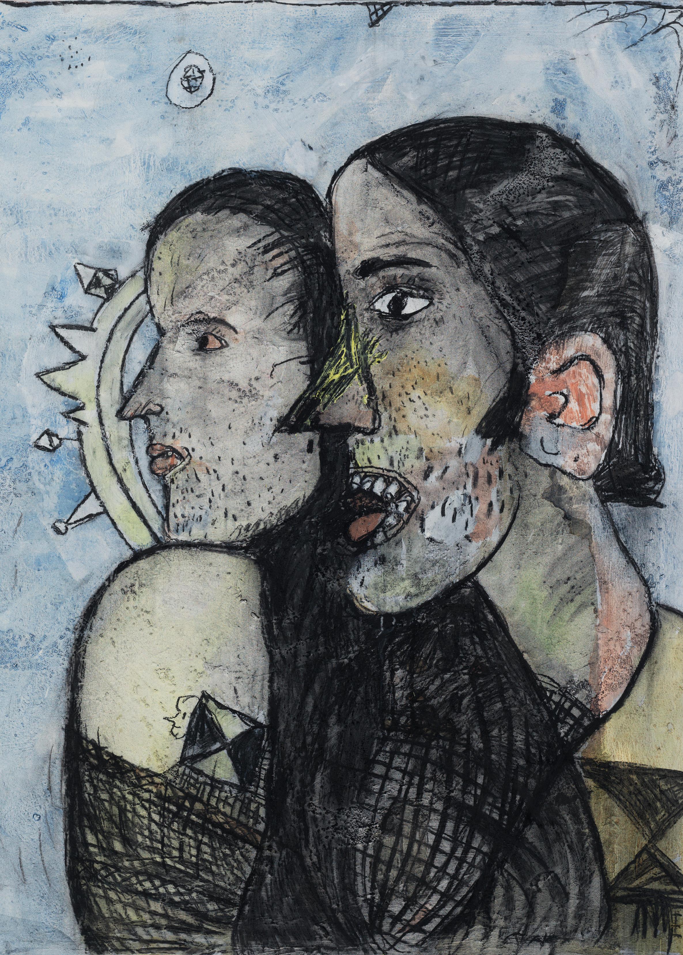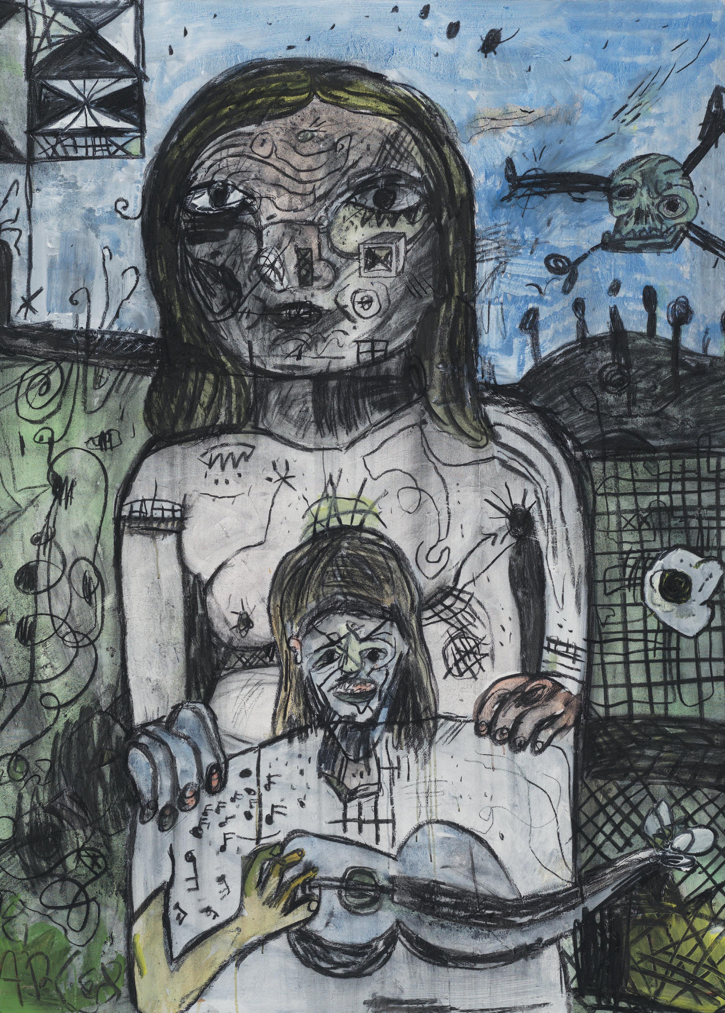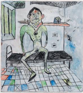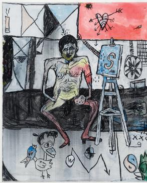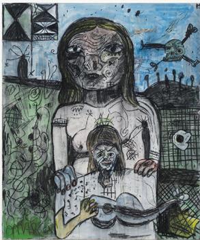 Diese Familie prekärer Existenzen wird vor allem mit den Mitteln der Zeichnung ins Bild gebracht. Es sind vielfältige Variationen des Kohlestrichs, die eingesetzt werden. Zartes Blau, Rosa oder hel les Gelb treten hinzu. Obwohl eine Realität erscheint, sind die Arbeiten nicht realistisch, sondern sie wirken wie einer Phantasie entsprungen, einer dennoch vom Erleben ausgehenden Einbildungskraft. Diese verfügt über ein Repertoire an grotesken, hässlichen, karikierenden Details, allerdings ohne Witz oder Spott.