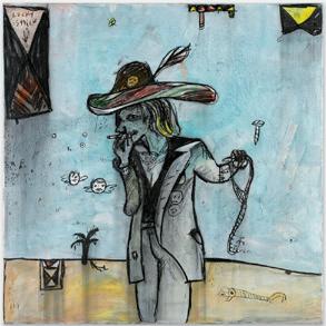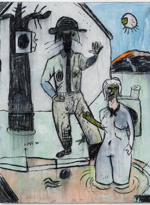 name just a few elements. The phenomenon could be perceived positively or deterrently, for example in the paintings of Fernand Léger (affirmative) or Max Beckmann (skeptical). Or in literature, e.g. in John Dos Passos’ “Manhattan Transfer” or even earlier in rudiments in James Joyce’s “Ulysses” or Alfred Döblin’s “Berlin Alexanderplatz”. The wild that shows itself in the jungles increasingly captures the attention in Marcel Eichner’s latest works. Even without exotic jungle depictions, the atmosphere of the wild can be conjured up. This requires the appropriate figures, for example a shady person like the one in the painting “David”. A masked figure with a pointed cap and a pistol in his right hand stands in a strange structure, which can be a nest, a piece of ground, a pedestal, with arrows shoo ting out of it. He is scantily dressed in tiger skin patterned shorts, a brassiere or bodice. Behind him is the rainbow with the arrow pointing from the lower right to the lower left. The wild manifests itself in the figure standing isolated in the pictorial space, obviously uninhibited, shameless, in the role of a “criminal”. Here the rainbow does not symbolize a conciliatory end of a calamity, but it plunges into the abyss, into a wilderness of ugliness, aggression and the ridiculous. For doesn’t this “gunslinger” also embody helplessness, as if he fears his masquerade. Then the whole thing drifts into that state of limbo that has already been mentioned. One can easily find further examples. “Schulferien” entails the motif of a mother, in front of her a child playing the guitar. But instead of the expected joy in view of the vacations, the viewer sees a multitude of hatchings, squiggles, patterns like tattoos, thus a great restlessness, mediated by the abstract elements of the picture. “Kette” exposes a provocative back nude that is being slapped by a clawed hand while the woman is petting a cat that is touching a rabbit. In view of the gestures, which are both aggressive and friendly, it becomes apparent once again that Marcel Eichner searches for such moments, where the first hidden, the wild, comes into the picture. The abstract elements appear nervous once again.
