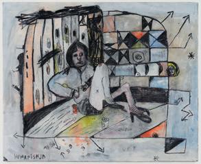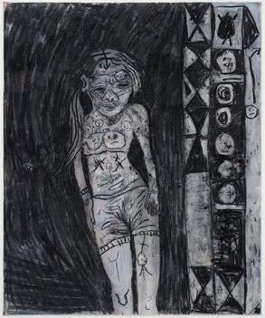 One more observation shouldn’t be overlooked, namely the restless, unruly strokes of the charcoal pencil. The essential driving force, that is, the brittleness of existences, already reveals itself in the style of the paintings. But the apparent clumsiness of the drawing is deceptive; for there is calculati on in such handling. An example may be the painting like the one with the woman sitting on the floor - a pitiful creature, with drinks beside her, leaning against a wooden wall, in which a knothole just above the shoulder imitates the female sex. Small and rather timidly, a swastika has been tattooed on her thigh. It looks like the Nazi symbol, but also like a violation, like a silent protest, like a provocation in the piano. The picture says very clearly how the drawing works, when it has been done over and over again. The lines become sometimes stronger, but remain wobbly, and as if searching. Contours, facial features, patterns, arrows often slip a hair’s breadth beside the “right”. Searching becomes the method of image genesis and this searching remains visible. It corresponds to the seemingly pointless waiting of the figures, who reveal no goals. They drift in the jungle of the city and get stuck here and there, where Marcel Eichner could catch sight of them or imagine them. What it looks like when the research is cut short is shown by two portraits of young women who are isolated. They look out of the portrait format. Sometimes seemingly confident, sometimes rather skeptical. Their black hair, along with their gazes, forms the most striking detail. They frame the faces, but even more they serve as protection, like helmets that provide security. From the frame of hair, the surroundings are caught in the eye, waiting, without illusions; for there have apparently been enough disappointments. Now the style of drawing has become ascetic, so that everything scenic is omitted. These women are alone with themselves and do not know where to turn. But they have left the precariousness of some other scenes, maybe they will find their way out.