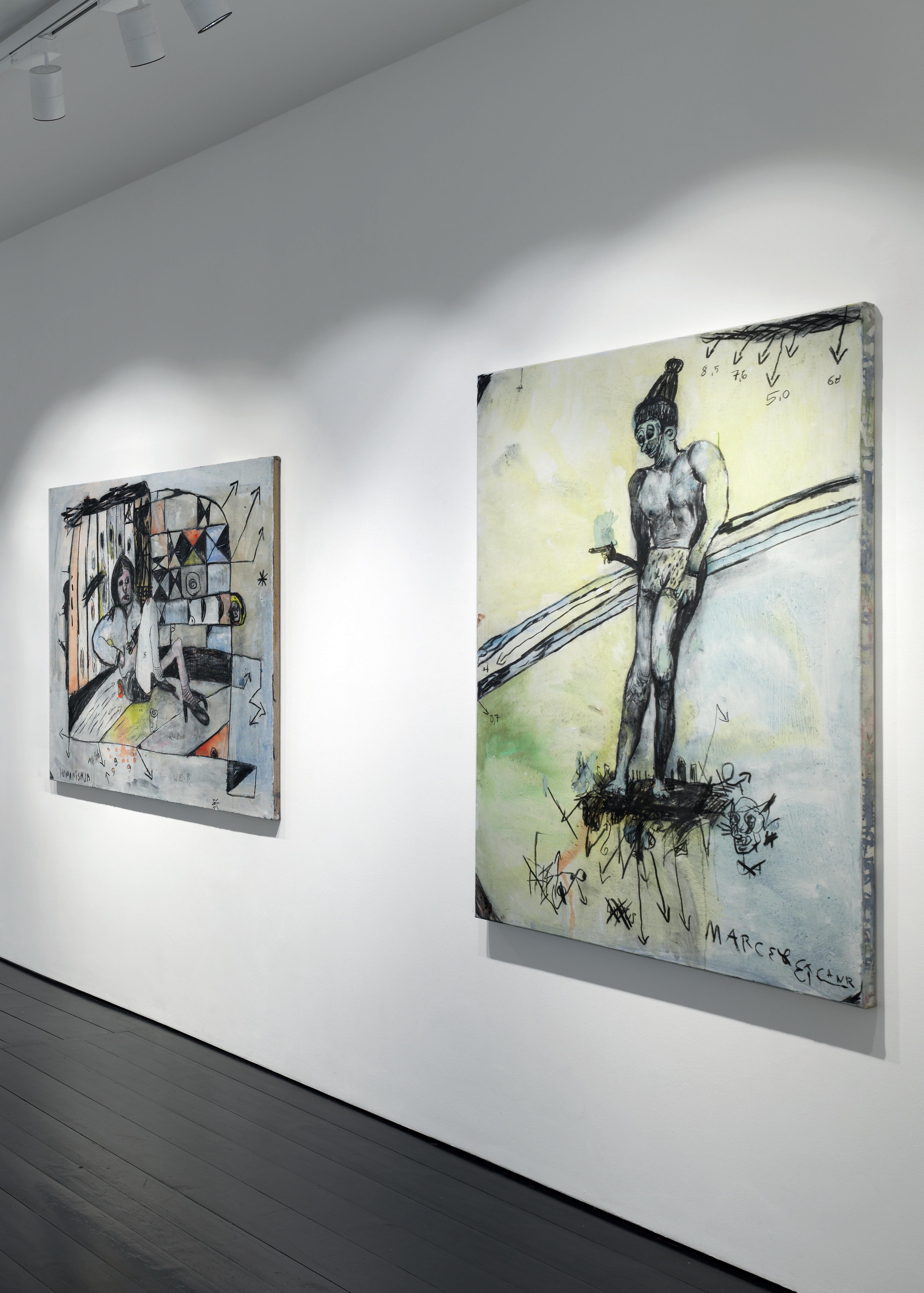 Where has the viewer ever encountered an atmosphere comparable to that in Marcel Eichner’s pain tings? The brittle strokes are similar to the early Paul Klee, they also remind us of the webs of Wols, of comics. Loneliness, abandonment, failed communication can be found in Bernard Buffet, in Philipp Guston, in A. R. Penck, in Jean Dubuffet. But there is also the opposite. When the scenes are brought to the point as in Picasso, E. L. Kirchner, Günther Förg, Carol Dunham and many others. The testing and the determination meet in one and the same picture. This can irritate some viewers. One expects a story, a clear statement either for or against something; for today it is the hour of black and white. This is precisely what the hidden images evade. If something is brought to the point, another element of the image questions this point. Hence the insistence on atmosphere, on moods that demand that the viewer participate in the picture himself. To do this, he must leave behind resistances, especially the unattractive situations in which the characters persist. If beauty as the goal of art was adopted a long time ago, then something comes to light that has always been associated with art, namely the fascination with the grotesque, the uncanny or the ugly. Alongside the history of the beautiful, there is an equally powerful tradition of the ugly. Here we often find a denser atmosphere than usual. De pictions of hell in Christian art are usually more alluring to the eye than the many angels singing or praying at the throne of God.