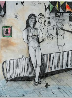 Eichner’s city and its interiors are distorted, enclosed by black lines conveying metropolitan isolati on; if the world is a stage, it can only be a stage of a circus, and all of us clowns. Almost anti-existentialist, the lines circumscribing Eichner’s creations are no different than the ones making up objects and buildings, pointing to an obliteration of boundaries between structure and those supposedly free from it, a la Sartre, a mutual conditioning of the world within and the world without. Entrapped by doors too small, keyholes leading nowhere, windows barred, clocks ticking; enclosed by mistakes crossed out, equations miscalculated, weathers misprognosed, Eichner’s figures engage in sexual perversions, harmful behaviours and misguided vanity, as if learning how to disappear completely. The woman wearing only her underwear in “Toxick”, for instance, having just lost at a game of strip poker, slowly evaporates into signs and cyphers, and as Eichner’s lines grow weaker, it becomes clear that losing is a concept she’s all too familiar with.