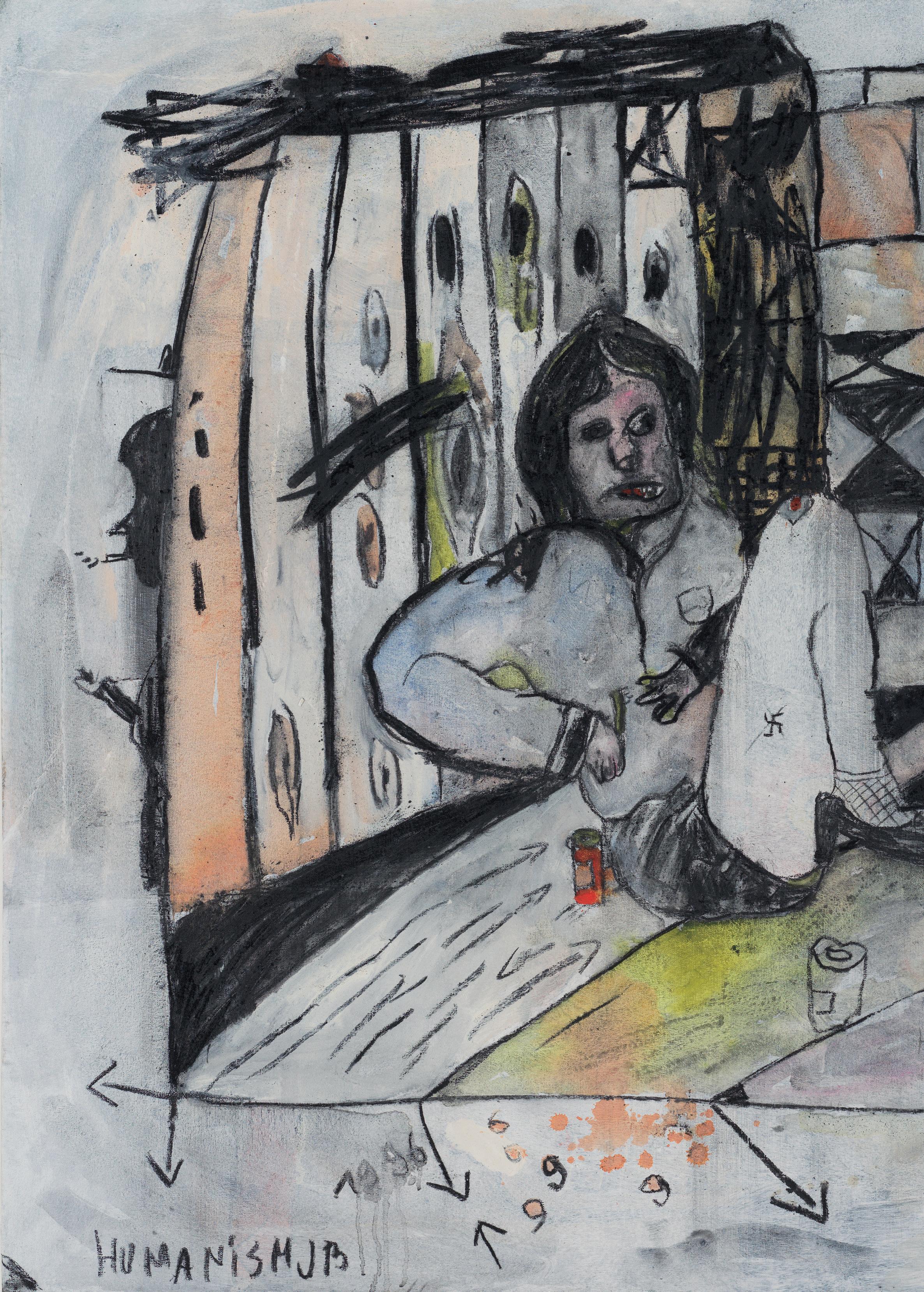 Es ist eine weitere Beobachtung einzubeziehen, nämlich die unruhige, widerspenstige Strichführung des Kohlestiftes. Mit dieser beginnt das wesentliche Antriebsmotiv, also die Brüchigkeit von Exis tenzen, schon im Stil der Bilder sich einzunisten. Aber die scheinbare Unbeholfenheit des Zeichnens täuscht; denn es steckt Kalkül in solcher Handhabung. Als Beispiel mag ein Bild wie das mit der Sitzenden am Boden dienen – ein bedauernswertes Geschöpf, mit Getränken neben sich, an eine Holzwand gelehnt, in der ein Astloch gleich über der Schulter das weibliche Geschlecht nachahmt. Klein und eher zaghaft wurde ein Hakenkreuz auf den Oberschenkel tätowiert. Es sieht aus wie das Nazi-Symbol, aber auch wie eine Verletzung, wie ein stummer Protest, wie eine Provokation im Piano. Das Bild sagt sehr deutlich, wie das Zeichnen wirkt, wenn immer wieder neu angesetzt worden ist. Die Linien werden teilweise kräftiger, aber bleiben wackelig, und wie suchend. Konturen, Gesichtszüge, Muster, Pfeile rutschen häufig um ein Haaresbreit neben das “Richtige“. Suchen wird zur Methode der Bildgenese und dieses Suchen bleibt sichtbar. Es entspricht dem anscheinend sinnlosen Warten der Figuren, die keine Ziele erkennen lassen. Sie treiben im Dschungel der Stadt und bleiben hier und dort hängen, wo Marcel Eichner ihrer ansichtig werden konnte oder sie imaginieren konnte. Wie es aussieht, wenn die Recherche abgekürzt wird, zeigen zwei Bildnisse von jungen Frauen, die vereinzelt sind. Sie schauen aus dem Hochformat. Mal scheinbar selbstsicher, mal eher skeptisch. Ihre schwar zen Haare bilden neben den Blicken das auffälligste Detail. Sie rahmen die Gesichter, aber mehr noch dienen sie dem Schutz, wie Helme, die Sicherheit gewähren. Aus dem Rahmen aus Haaren wird die Umgebung ins Auge gefasst, abwartend, ohne Illusionen; denn Enttäuschungen hat es anscheinend schon genug gegeben. Jetzt ist der Stil des Zeichnens asketisch geworden, so dass alles Szenische entfällt. Diese Frauen sind mit sich allein und wissen nicht, wohin sie sich wenden sollen. Aber das Prekäre mancher anderer Szenen haben sie verlassen, vielleicht finden sie ihren Ausweg.