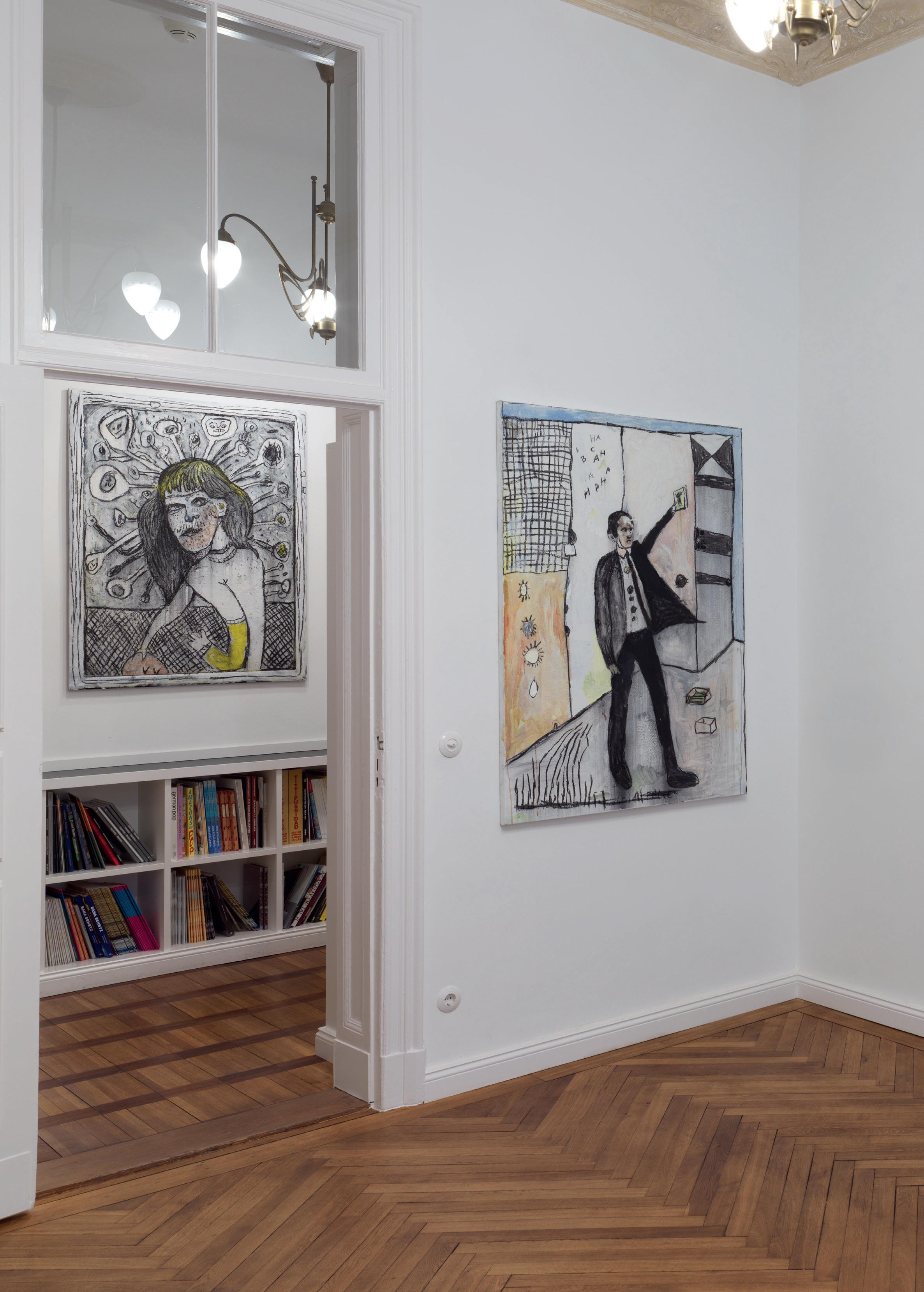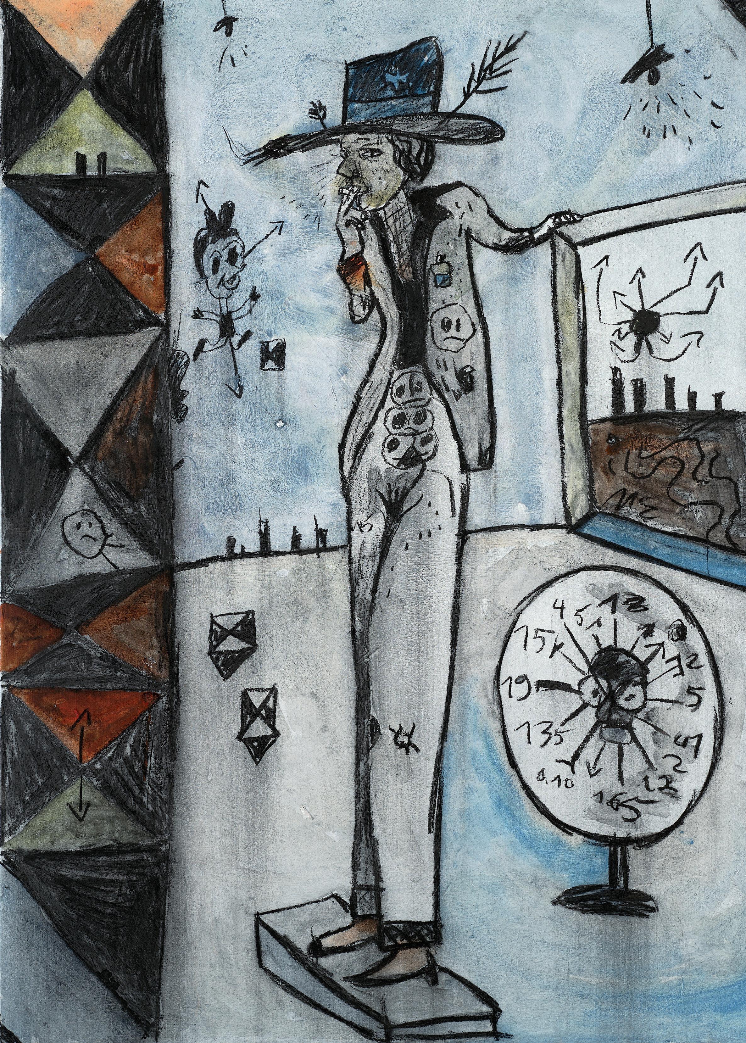 These characters for whom luck seems to be merely a rare guest find themselves in unfortunate cir cumstances deconstructed on the plane of the image by means of words, numbers, thought bubbles and doodles. So, like sometimes even Buffet, Eichner is no stranger to the colorful aspects of the world around us. These things, ornaments and animals are often done in bright colours, suggesting a glimmer of hope and childish playfulness in Eichner’s paintings. For example, the figure in “Lange Beine” looks away from what seems to be a large rudimentary drawing of a virus. Eichner conveys information through every symbol available, creating a visual system of seemingly unrelated, but ulti mately codependent factors of any given situation.