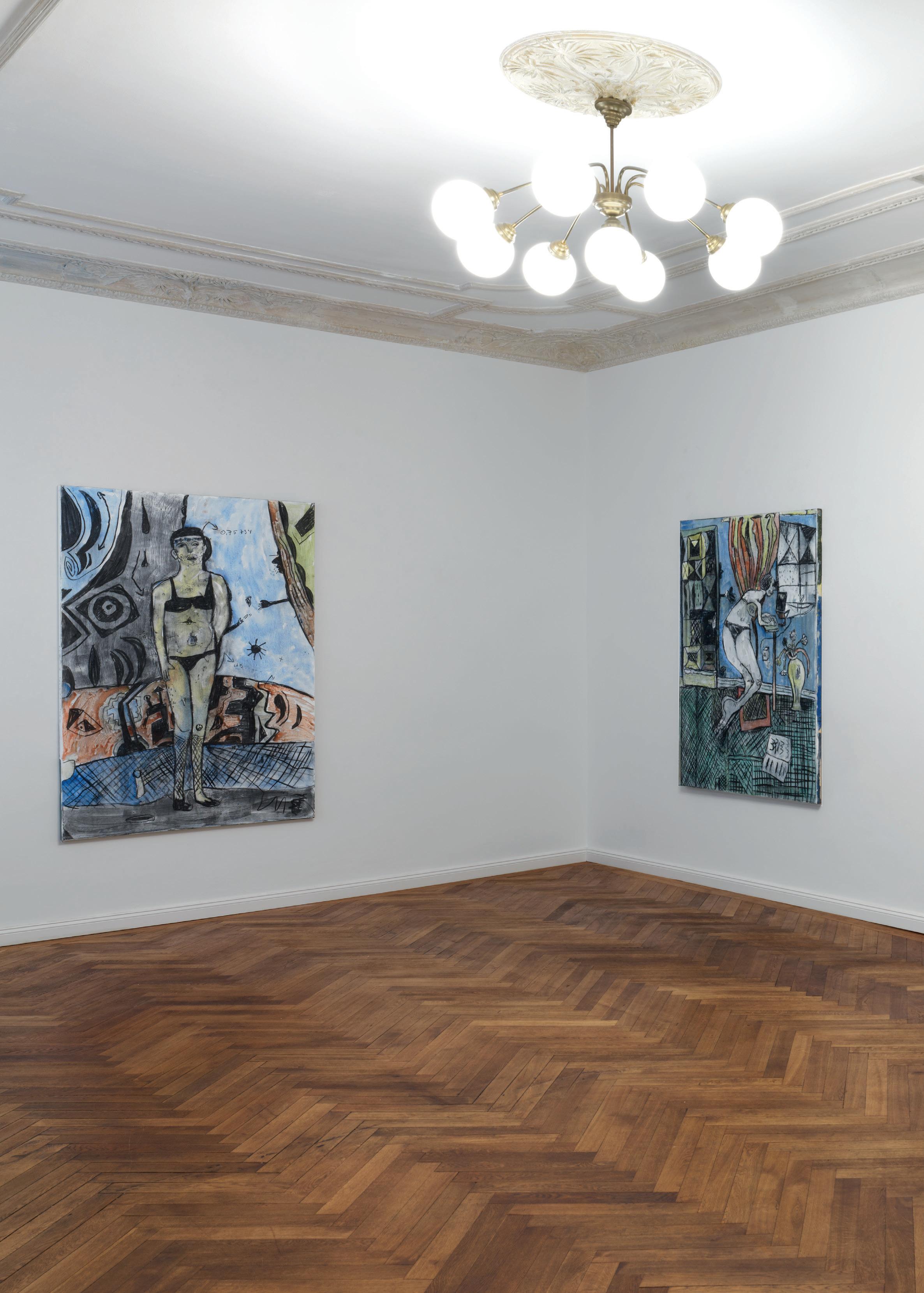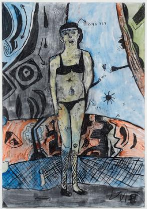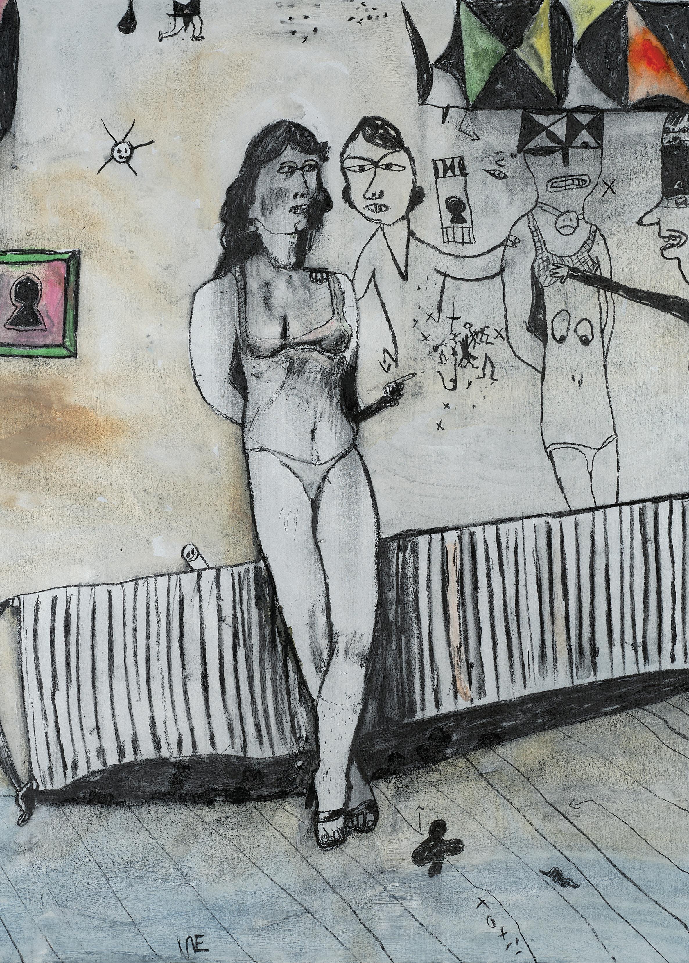 Eichners Stadt und ihre Räume sind verzerrt, umschlossen von schwarzen Strichen, die die Isolation der Großstadt suggerieren sollen. Wenn die Welt eine Bühne ist, kann sie nur die Bühne eines Zirkus sein, und wir alle sind ihre Clowns. Fast antiexistenzialistisch sind die Linien, die Eichners Kreationen umschreiben, nicht anders als die, aus denen Objekte und Gebäude bestehen, und verweisen auf eine Verwischung der Grenzen zwischen der Struktur und denen, die angeblich frei von ihr sind, à la Sart re: eine gegenseitige Konditionierung der inneren und äußeren Welt. Gefangen von zu kleinen Türen, Schlüssellöchern, die nirgendwohin führen, vergitterten Fenstern und tickenden Uhren, eingeschlos sen von durchgestrichenen Fehlern, falsch berechneten Gleichungen und falsch prognostiziertem Wetter, lassen sich Eichners Figuren auf sexuelle Perversionen, schädliche Verhaltensweisen und fehlgeleitete Eitelkeiten ein, so als ob sie lernen würden, ganz zu verschwinden. Die nur mit Unterwä sche bekleidete Frau in „Toxick“, die gerade beim Strip-Poker, verloren hat, löst sich langsam in Zei chen und Ziffern auf. Mit dem zunehmenden Verschwinden des texthaften Bildinhalts wird deutlich, dass die abgebildete Frau mit dem Konzept des Verlierens nur allzu vertraut ist.