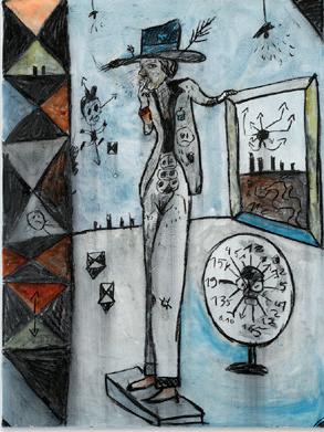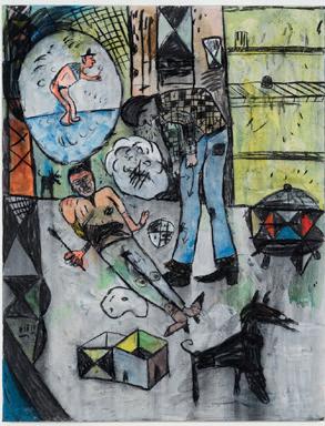 Der Dschungel kann als das Wilde an sich gesehen werden. Hier geht es drunter und drüber; es wächst, kämpft, wuchert, verknotet sich, wird undurchdringlich. Im 20. Jahrhundert wurde der Begriff von der Natur auf die Großstadt übertragen, ein Dschungel entstand zwischen Straßen, Häu sern, Menschen, Verkehr, Schildern, Reklamen, um nur einige Elemente zu nennen. Das Phänomen konnte man positiv oder abschreckend wahrnehmen, z. B. in den Gemälden von Fernand Léger (beja hend) oder Max Beckmann (skeptisch). Oder in der Literatur, z. B. bei John Dos Passos “Manhattan Transfer“ oder früher schon in Ansätzen bei James Joyce in “Ulysses“ oder Alfred Döblin in “Berlin Alexanderplatz“. Das Wilde, was sich in den Dschungeln zeigt, nimmt in den neuesten Arbeiten von Marcel Eichner immer stärker die Aufmerksamkeit gefangen. Selbst ohne exotische Dschungeldar stellung lässt sich die Atmosphäre des Wilden beschwören. Dazu bedarf es der geeigneten Figuren, z. B. einer zwielichtigen Person wie in dem Bild “David“. Eine maskierte Gestalt mit einer Zipfelmütze und einer Pistole in der Rechten steht in einem merkwürdigen Gebilde, das ein Nest, ein Stück Boden, ein Podest sein kann, aus dem Pfeile hervorschießen. Sie ist spärlich bekleidet mit einer kurzen Hose in Tigerfellmuster, einem Büstenhalter oder Leibchen. Dahinter der Regenbogen, dessen Pfeil von rechts nach links unten weist. Das Wilde manifestiert sich in der Figur, die isoliert im Bildraum steht, offensichtlich hemmungslos, schamlos, in der Rolle “Verbrecher“. Hier symbolisiert der Regenbo gen kein versöhnliches Ende einer Katastrophe, sondern er stürzt in den Abgrund, in eine Wildnis aus Hässlichkeit, Aggression und Lächerlichem. Denn verkörpert dieser “Revolverheld“ nicht auch Hilf losigkeit, als ob er Angst vor seiner Maskerade empfindet. Dann driftet das Ganze in jenen Schwebe zustand, von dem schon die Rede war. Weitere Beispiele ließen sich leicht finden. “Schulferien“ heißt das Motiv einer Mutter, vor ihr ein Gitarre spielendes Kind. Aber statt der zu erwartenden Freude angesichts der Ferien, sieht der Betrachter eine Vielzahl von Schraffuren, Kringeln, Muster wie Tat toos, also eine große Unrast, vermittelt durch die abstrakten Elemente des Bildes. “Kette“ entblößt sich dem Betrachter ein aufreizender Rückenakt, dem eine krallenartige Hand einen Schlag versetzt, während die Frau eine Katze streichelt, die einen Hasen berührt. Angesichts der sowohl aggressiven als auch freundlichen Gesten wird erneut sichtbar, dass Marcel Eichner solche Momente sucht, wo das zuerst Verborgene, das Wilde ins Bild kommt. Wieder sind es die abstrakten Elemente, die ner vös erscheinen.