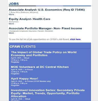 CFAW Industry Brief is CFA Society Washington, DC’s weekly digital newsletter featuring curated industry news, Society updates, and highlights from our local committees. Members receive timely insights and stay informed about upcoming events and opportunities within the DMV region.