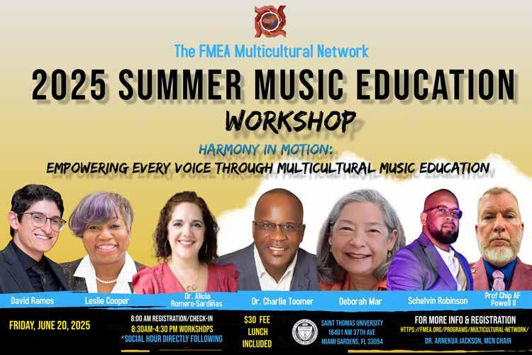 The annual FMEA Multicultural Network (MCN) Summer Music Education Conference Workshop “Harmony in Motion” will be held on June 20, 2025, at St. Thomas University. For more information, please see the FMEA website.