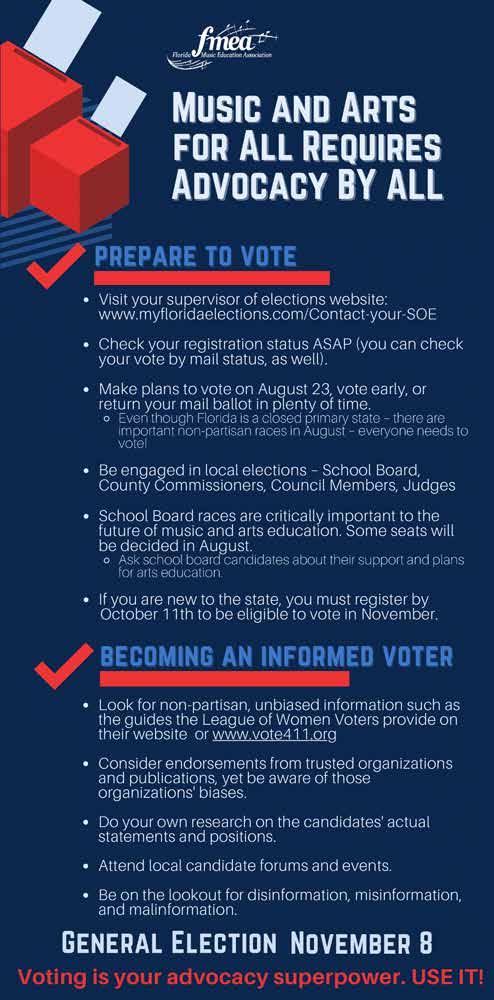 Greetings, colleagues! First I would like to convey my sincere hope of recovery for all of our communities that have been impacted by Hurricane Ian. Our hearts go out to each of you, your students, and your programs, offering positive momentum during adversity. I’m sure emotions are high with sadness, anxiety, anger, and I hope some opti mism. I encourage you to stay positive. One of the greatest traits of being a music teacher is the ability to work through dif ficult situations. Florida Music Education Association (FMEA) is here to serve our component groups. We have a page on our FMEA website (FMEA.org/help) where you can offer help or request help related to your program’s specific needs at this time. I’m reminded of a quote that urges us to “Let your light so shine, that oth ers will see your good work.” Amongst everything going on in our world today, this is certainly an opportunity for music teachers across our state to be the guiding