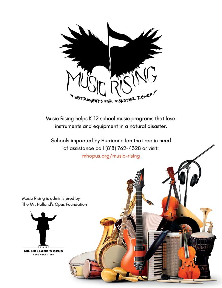 Administered by the Mr. Holland’s Opus Foundation (MHOF), Music Rising is a national relief fund for schools affected by natural disasters in the United States and U.S. terri tories. In response to Hurricane Ian and its damage to Florida, schools that experienced loss of or damage to musical instruments may qualify for a donation of instruments through the Music Rising program. Schools