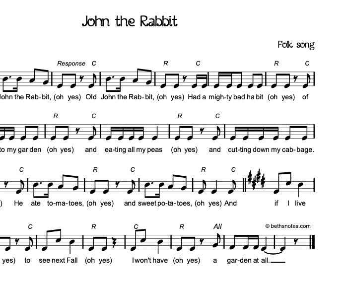 from Orff instruments. One of my favorite songs is “John the Rabbit.” The call is a sentence followed by a repeated onenote response.