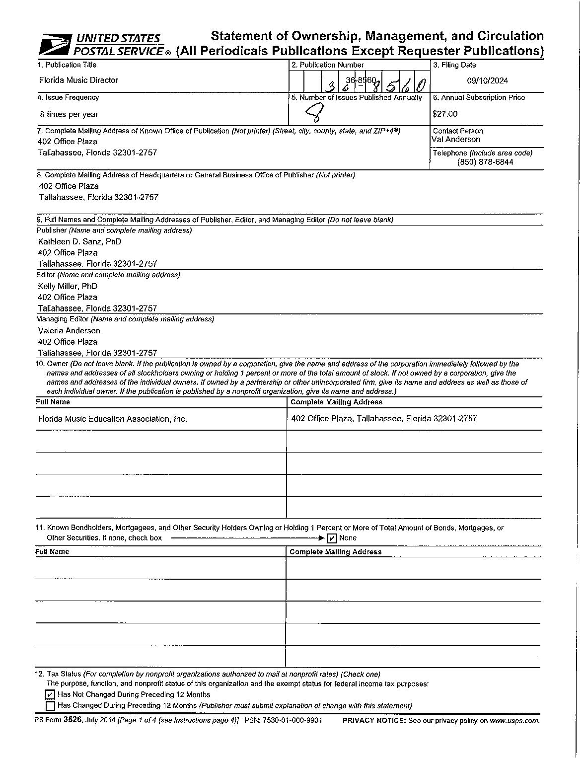 CIRCULATION: The circulation of the Florida Music Director is 4,500 educators. Published eight times annually by The Florida Music Education Association, Hinckley Center for Fine Arts Education: 402 Office Plaza, Tallahassee, FL 323012757. FMEA reserves the right to approve any application for appearance and to edit all materials proposed for distribution. Permission is granted to all FMEA members to reprint articles from the Florida Music Director for non-commercial, educational purposes. Non-members may request permission from the FMEA office.