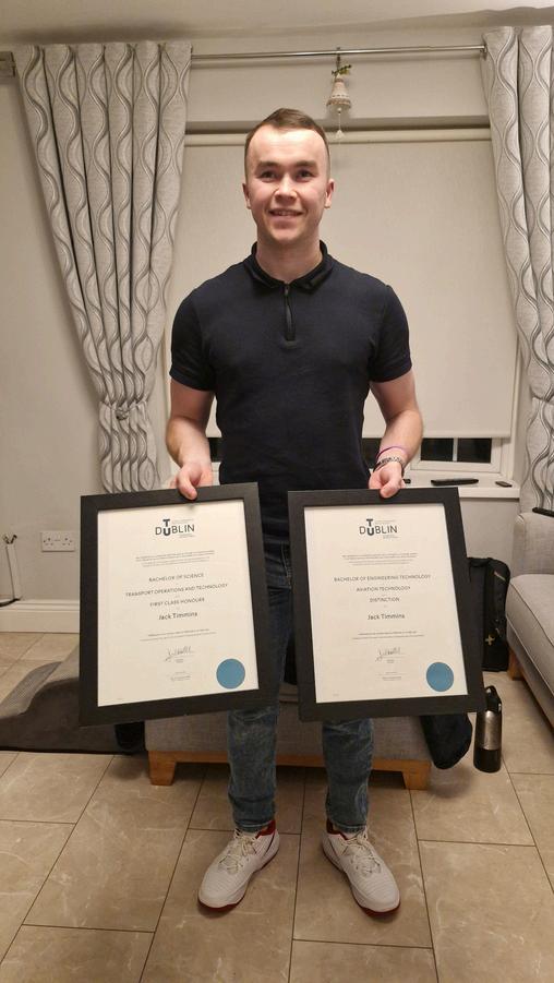 Jack chose his study path based on his interests, rather than the qualification When he delved down into the modules, this path turned out to be Aviation Technology - a three-year course in Dublin Although Jack was due to graduate in 2020, due to the pandemic, the college allowed students to join the last year of the level 8 Transport Operations and Technology degree as some of the modules overlapped. This final year gave Jack a deeper knowledge of the field and he found there was a good balance between subjects he needed for example maths, and the subjects he enjoyed such as aviation legislation Having entered third level on a three-year course, Jack graduated with a Level 7 degree in Aviation Technology and a Level 8 degree in Transport Operations and Technology.