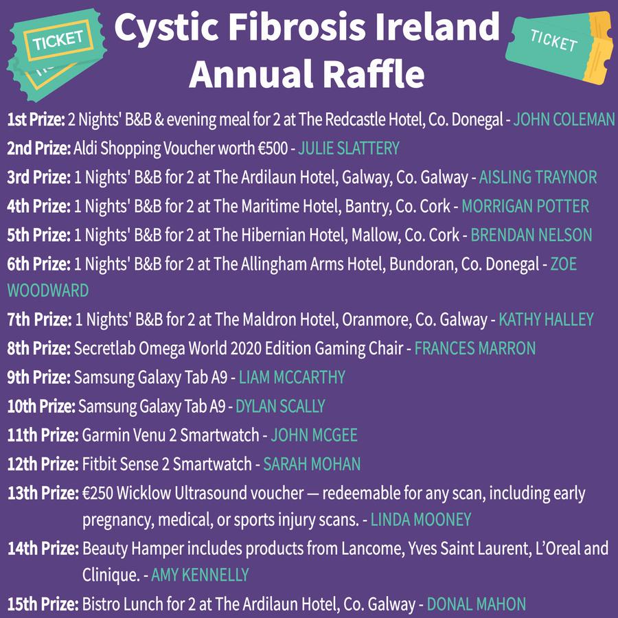 A massive THANK YOU to everyone who purchased tickets for our Annual Raffle in support of Cystic Fibrosis Ireland and our generous sponsors of all the lovely prizes