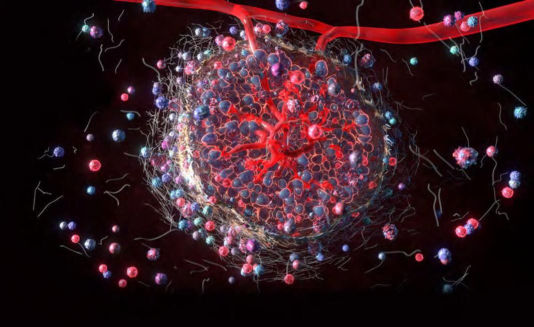 3D illustration of the tumor microenvironment, showing complex cellular interactions among immune cells, stromal components, and extracellular matrix, highlighting support for tumor growth and immune evasion.