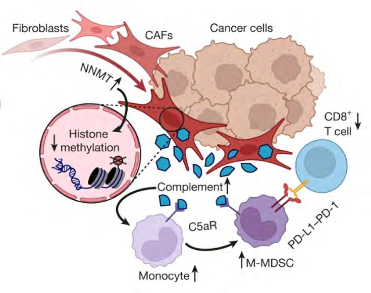 Image above: Schematic showing nicotinamide N-methyl transferase (NNMT)-expressing cancer-associated fibroblasts (CAFs) recruiting monocytic myeloid-derived suppressor cells (M-MDSCs) via complement factors to suppress T cells; NNMT inhibitors reduce this effect and restore CD8+ T cell function.